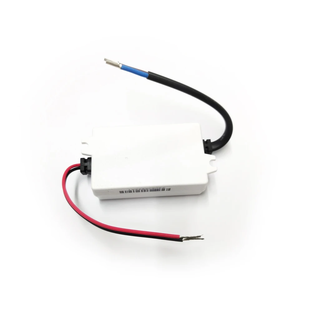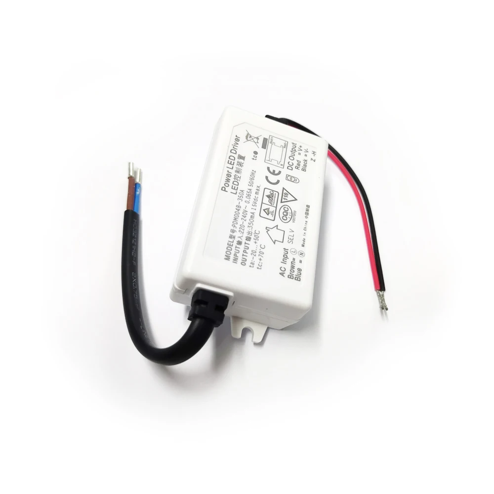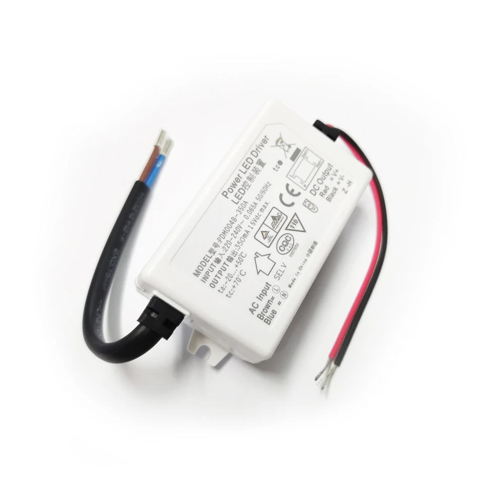 Experience seamless LED lighting with this high-quality PDM004B-350A LED driver, designed for optimal performance in your lighting setups. Its compact, rectangular white plastic casing offers a clean, modern look while ensuring durability and heat dissipation. The device is easy to install, featuring a male power input connector and two insulated wires—red for positive output and black for ground—exposed for secure connections. With a consistent output of 15V DC and 350mA current, it guarantees stable and efficient power delivery for Philips-compatible LED modules. Safety symbols and clear connection diagrams printed on the surface provide user confidence, making it suitable for professional or DIY projects. Trust this component to power your LEDs safely and reliably.