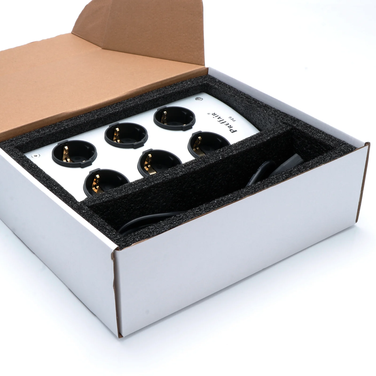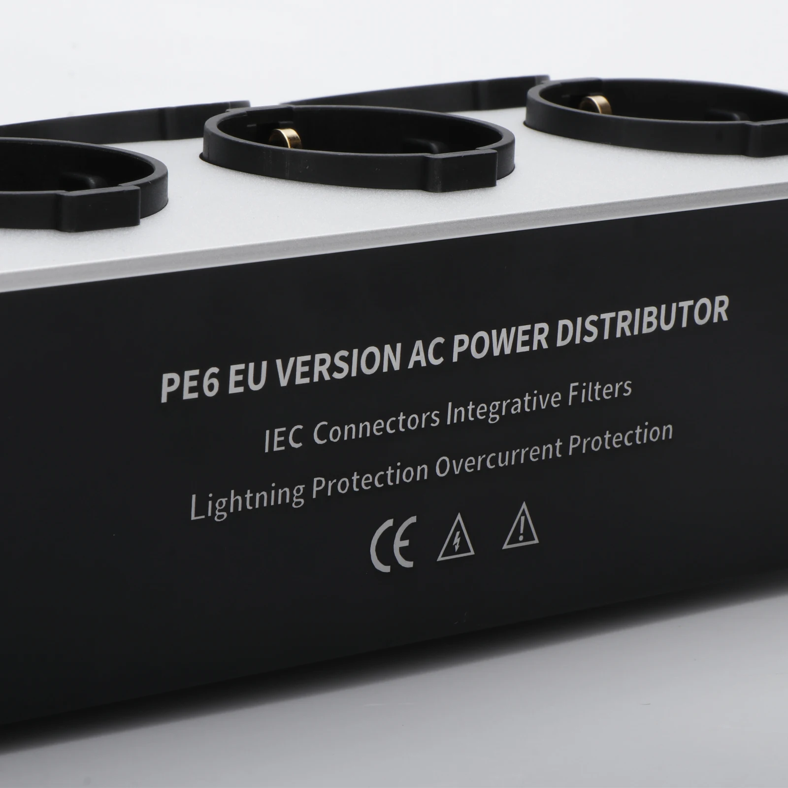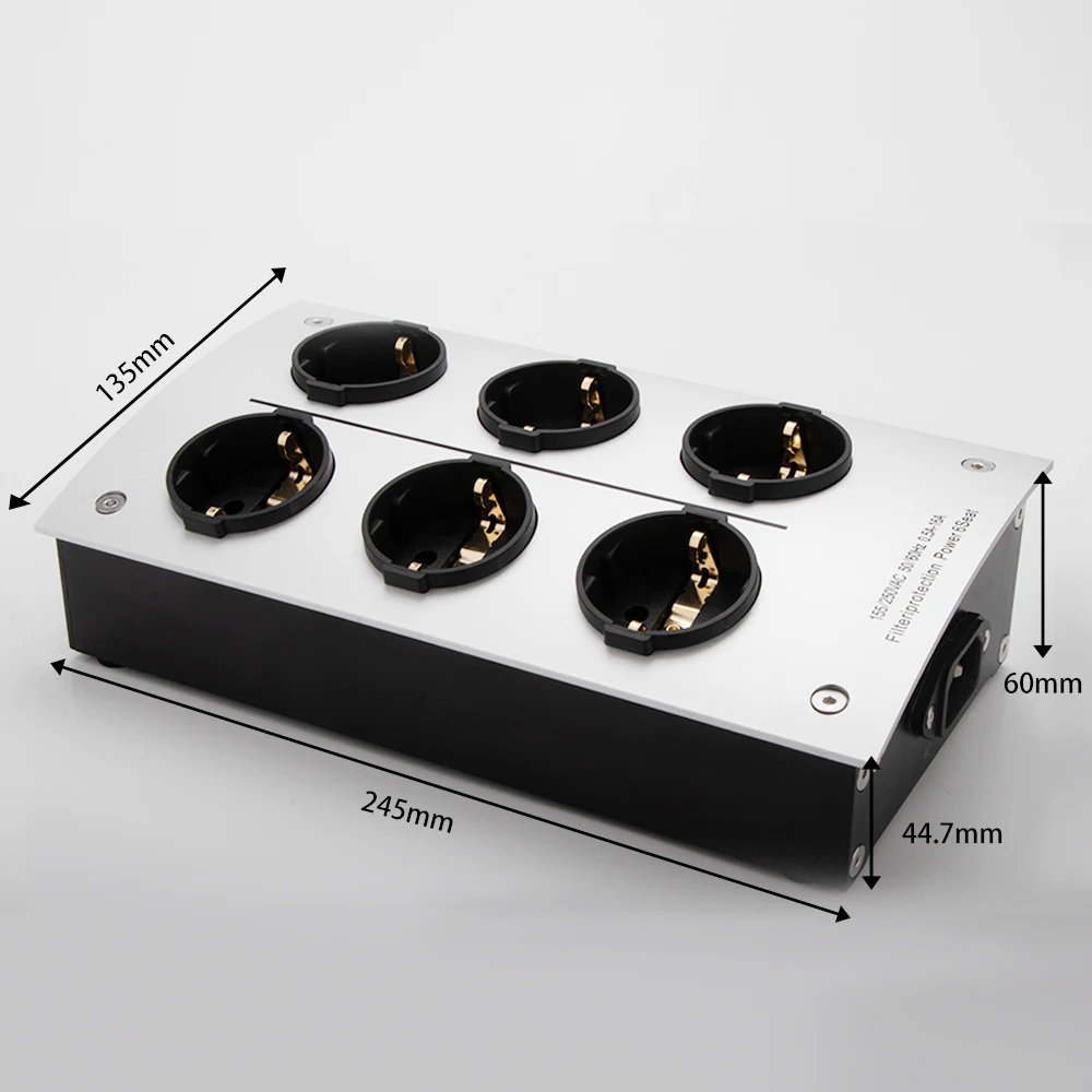 Enhance your high-fidelity audio setup with this sleek, modern EU-standard power filter socket. Crafted from durable high-quality plastic in a polished silver finish, it features six black Schuko outlets arranged in a 2×3 grid, recessed for secure connections and minimal interference. The unit includes an IEC inlet, overload protection, voltage regulation, and noise reduction capabilities to ensure a purified power supply and reduced background noise. With a voltage compatibility of 125V-250V at 50/60Hz and a current capacity of 16A, this robust power distributor is ideal for professional audio and electronic applications, delivering both reliability and superior sound quality.