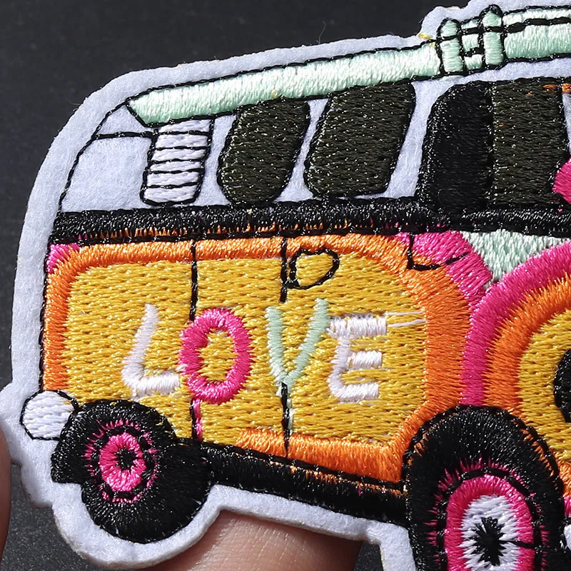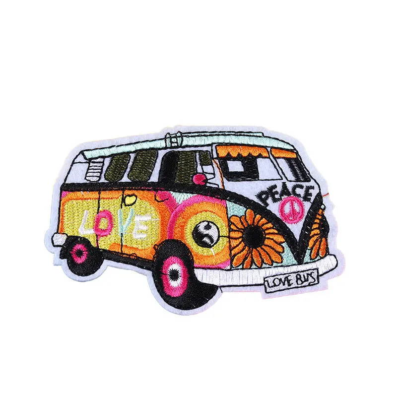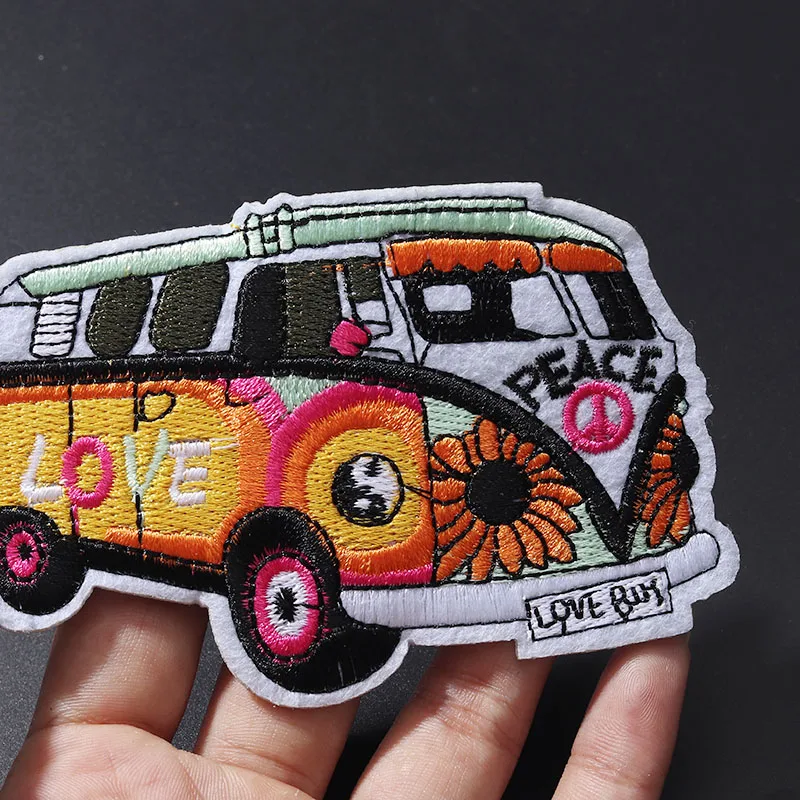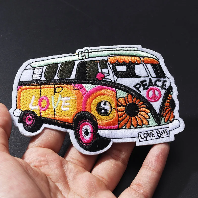 Transform your clothing with this enchanting embroidered iron-on patch inspired by a vintage bus and a “peace and love” theme. Vibrantly designed in shades of orange and yellow, with cheerful accents of pink, green, and black, this patch features the bold word “LOVE” prominently stitched along the side. Adorned with a whimsical sunflower at the rear and the word “PEACE” alongside a peace symbol above the bus, its playful aesthetic will surely stand out. Crafted from durable non-woven fabric, this eco-friendly patch combines quality with artistry. Easily apply it to your apparel using sewing or ironing methods for a unique, personalized touch.