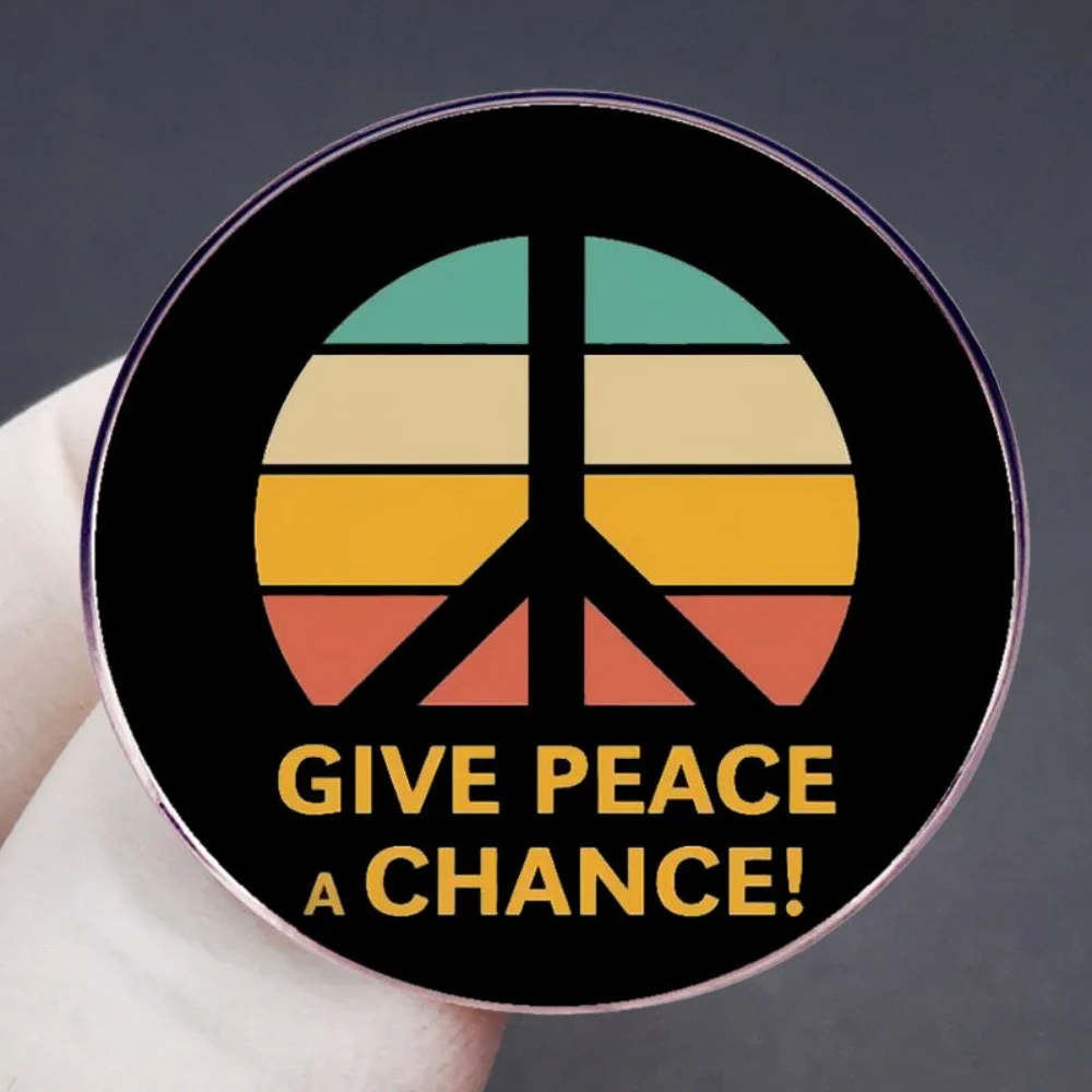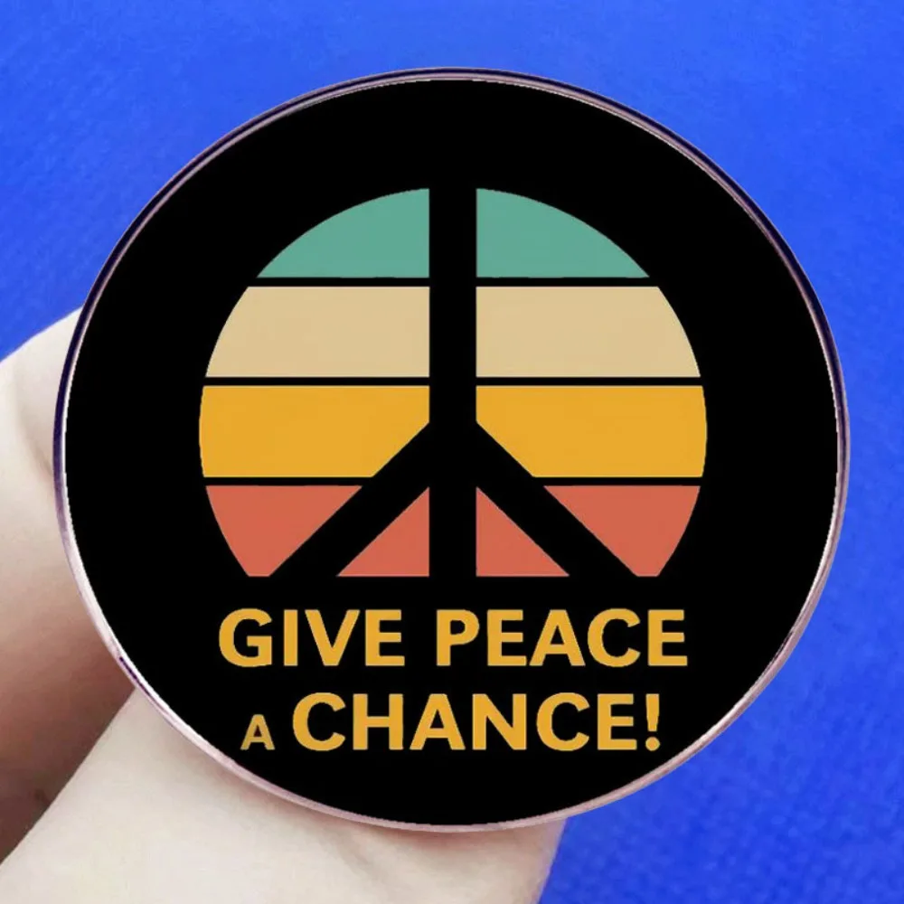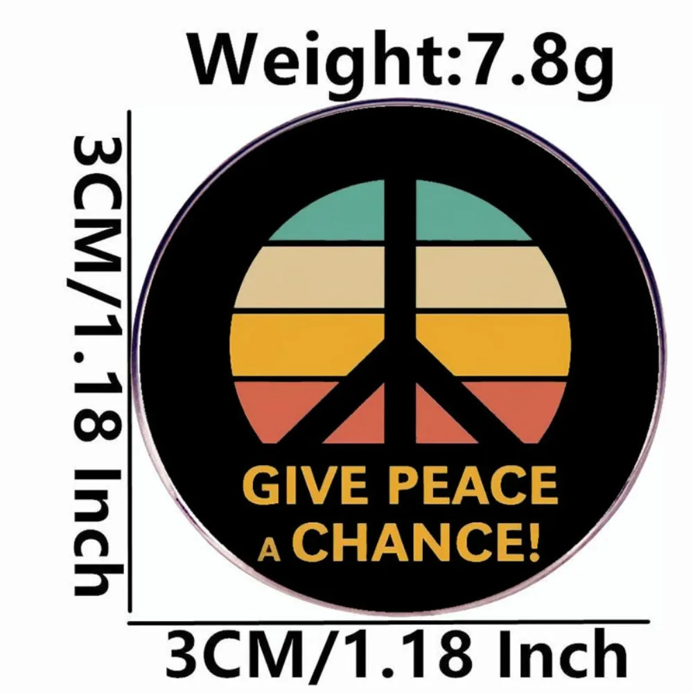 Imagine elevating your outfit with this eye-catching metal pin, which effortlessly blends retro appeal with modern trendiness. Crafted from durable alloy, this unisex accessory features a sleek black background with a vibrant, vintage-inspired peace symbol. Horizontal stripes in muted shades of teal, beige, amber yellow, and reddish-brown fill the circle, creating a colorful and harmonious look. Below the symbol, bold yellow text reads “GIVE PEACE A CHANCE!”, offering a striking contrast that makes the design pop. Perfect for jackets, backpacks, hats, or custom clothing projects, this lightweight pin adds personality and message to your style. Its polished finish ensures a smooth, high-quality appearance, making it a versatile accessory for everyday life or special outfits.