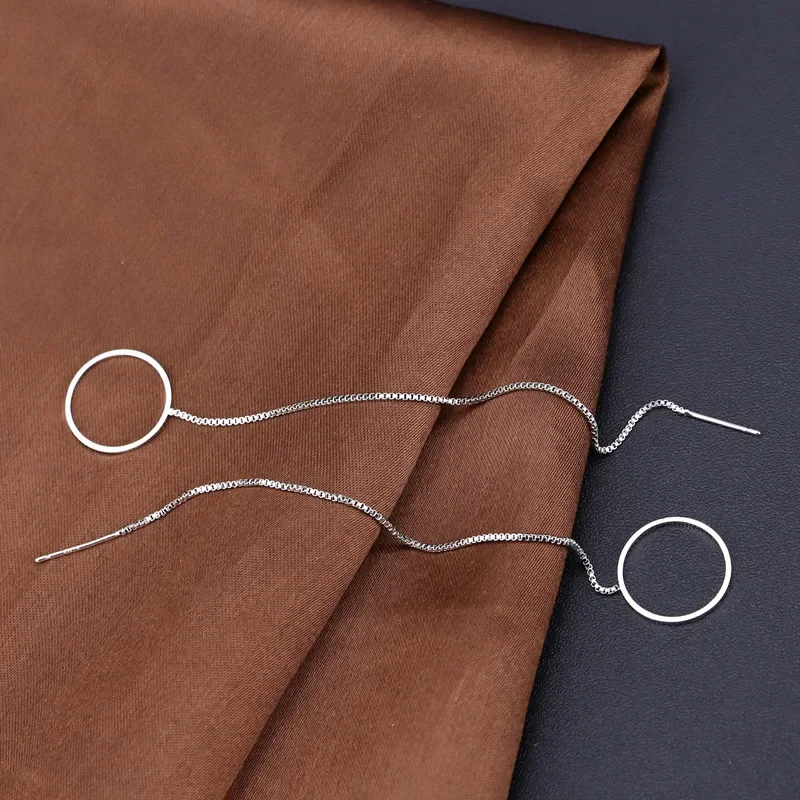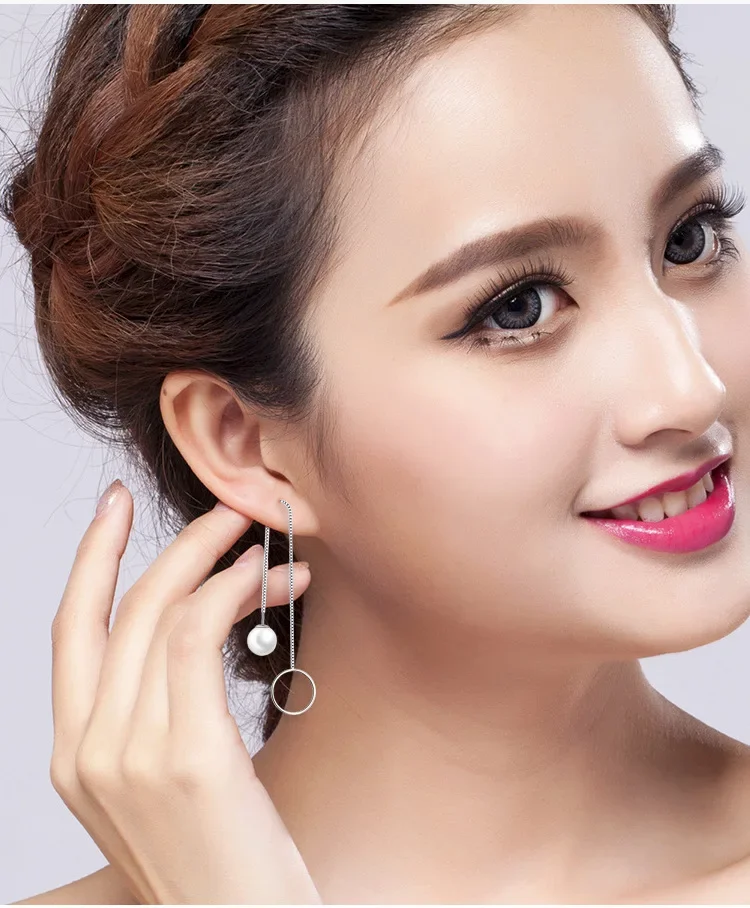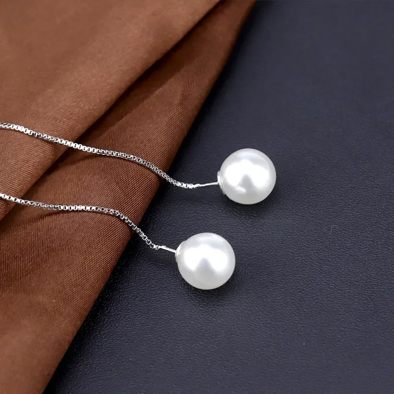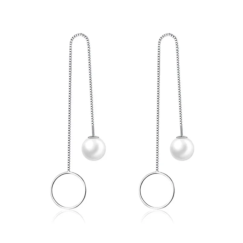 Elevate your look with these trendy drop earrings crafted from 925 silver, featuring a sleek, geometric round design. Each earring showcases a lustrous white pearl as the centerpiece, attached to a delicate, shiny silver chain that lengthens the silhouette for a refined, elongated appearance. Weighing approximately 1 gram, these earrings are perfect for special occasions like weddings, combining minimalist elegance with modern style. Free from high-concern chemicals and made with non-metallic materials, they offer a sophisticated yet safe accessory to enhance your outfit. Experience timeless beauty and contemporary design in one stunning piece.