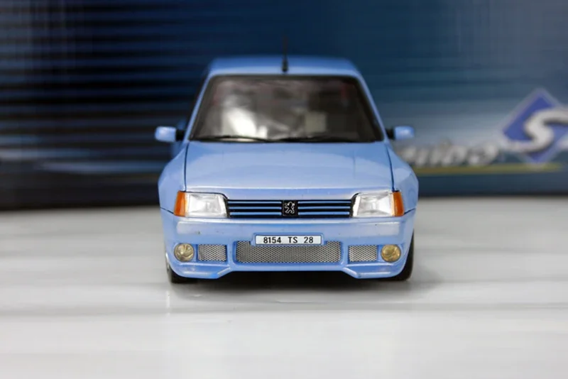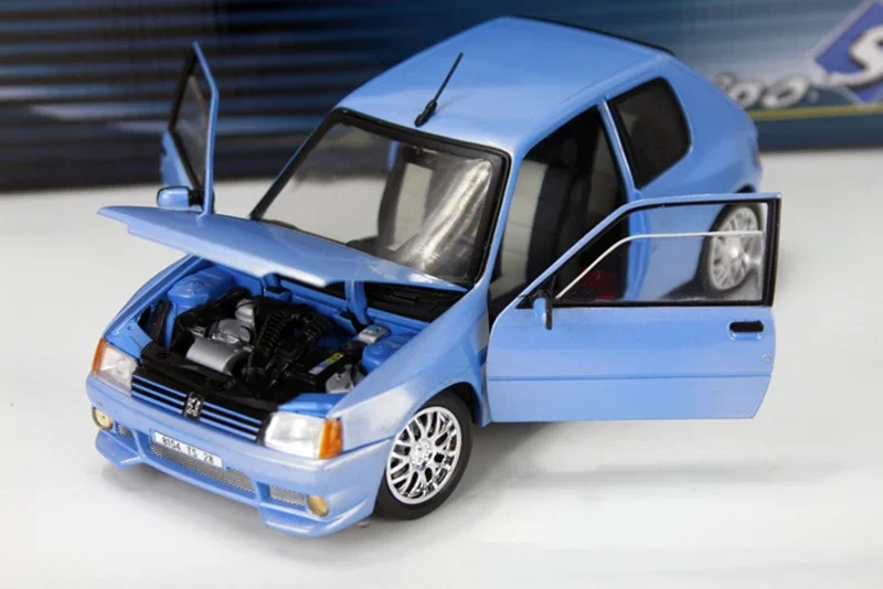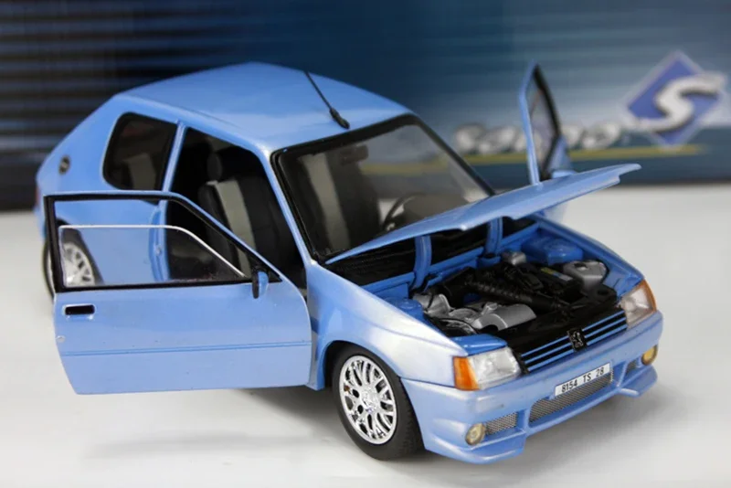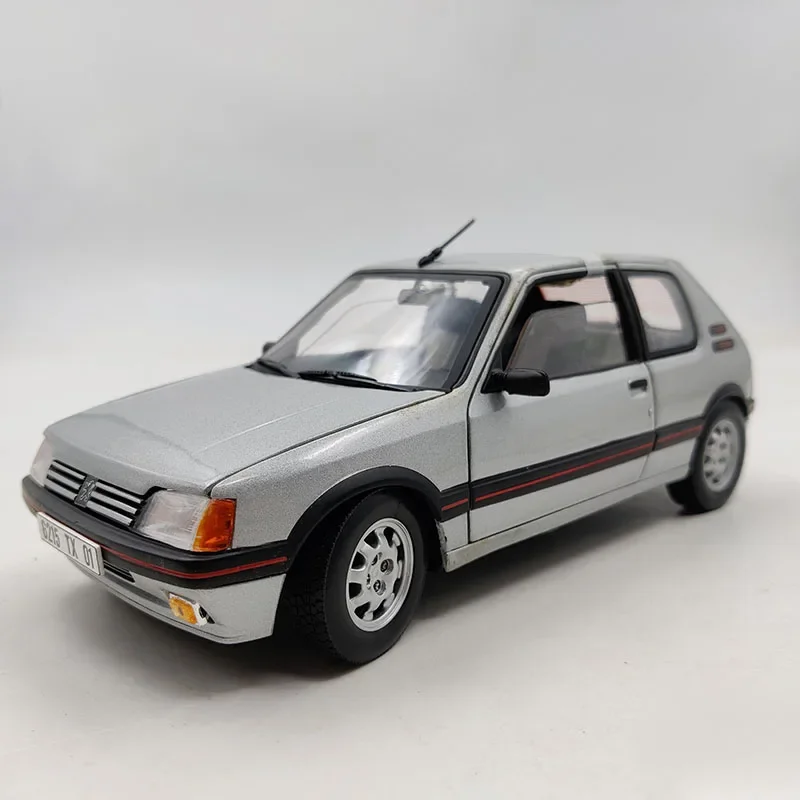 - Static display model with detailed styling, featuring a black grille, side mirrors, and contoured lines to emulate the real Peugeot 205 GTI's energetic and dynamic silhouette.