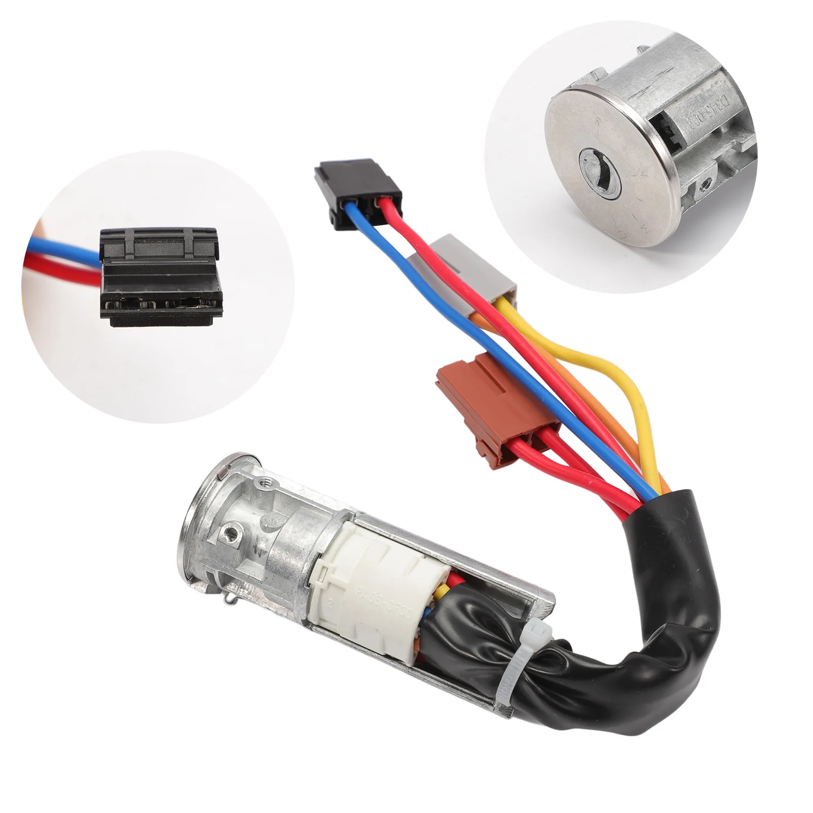 The Car Ignition Switch is a high-quality replacement designed for PEUGEOT models 106 I, 106 II, 405 I, and 405 II, for production years 1994 onward. This ignition switch features a sleek, shiny silver metal finish with an intricately grooved cylindrical body and a durable metallic collar for secure operation. It includes two identical keys with a flat metallized design and convenient plastic grips. The device is equipped with five color-coded wires—blue, yellow, red, brown, and gray—encased in a black protective sleeve, ensuring compatibility with vehicles powered by the 1.0-Electric engine from January 1987 to April 2004. OEM numbers include 4162.92, 416292, 4162-92, and 96084980.