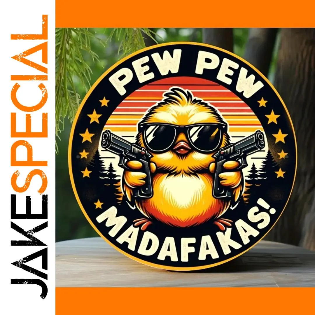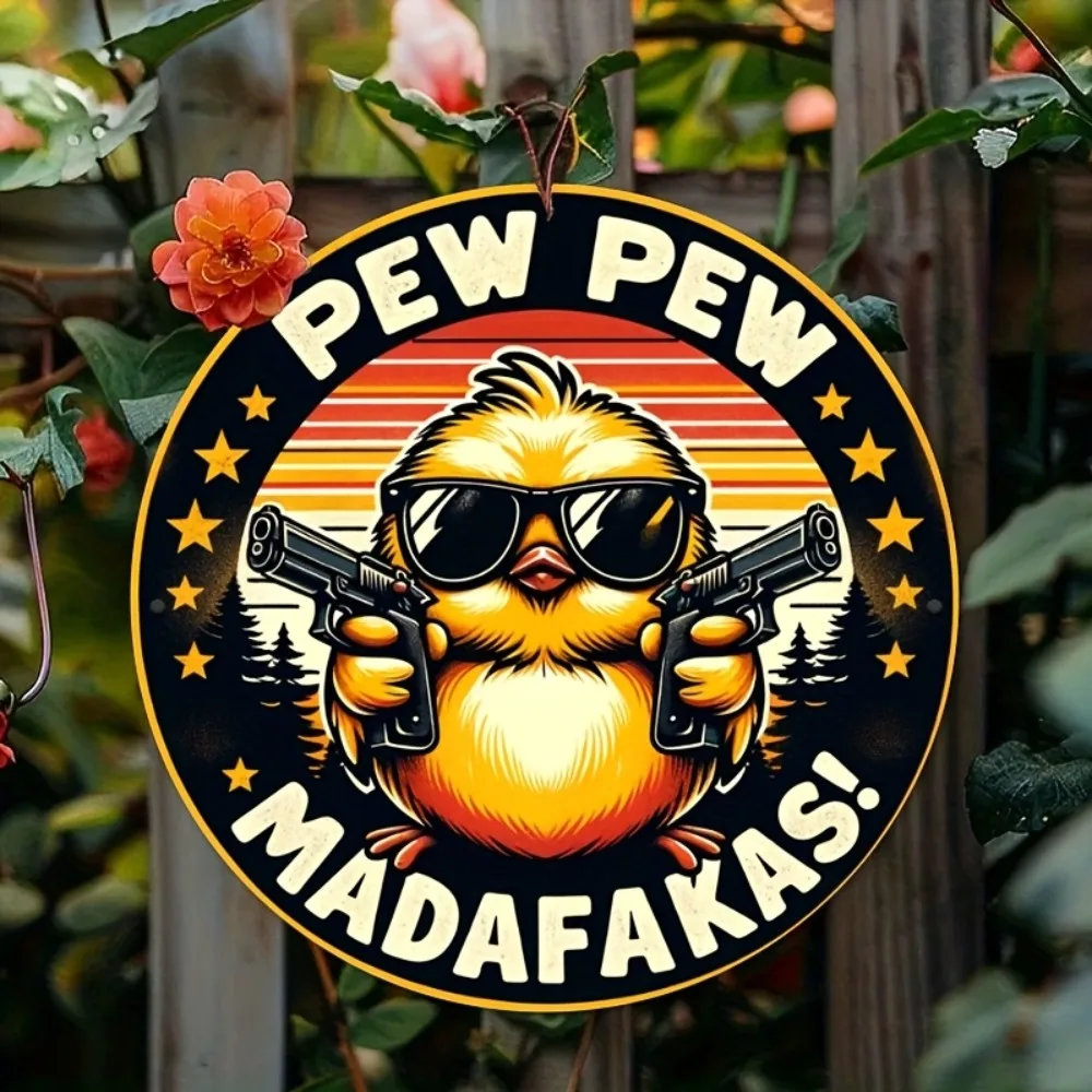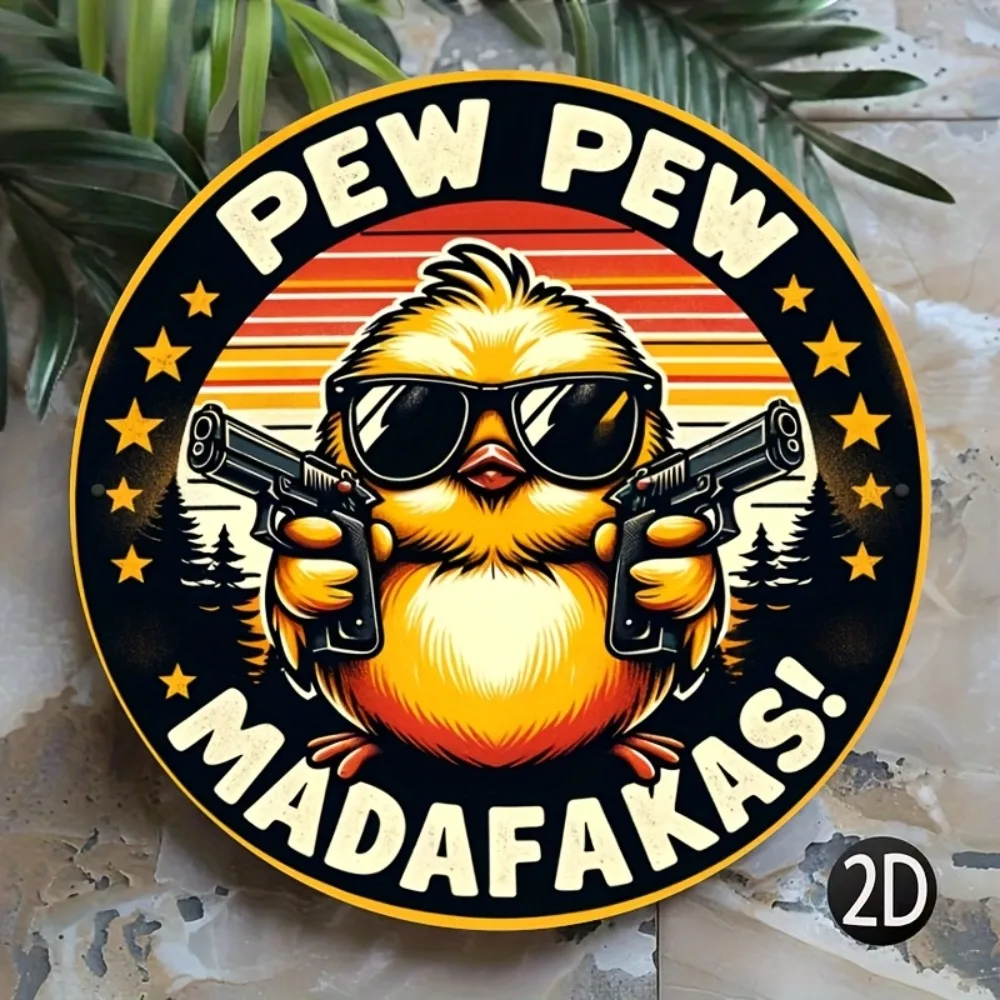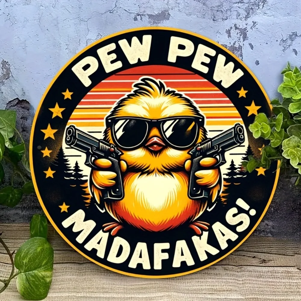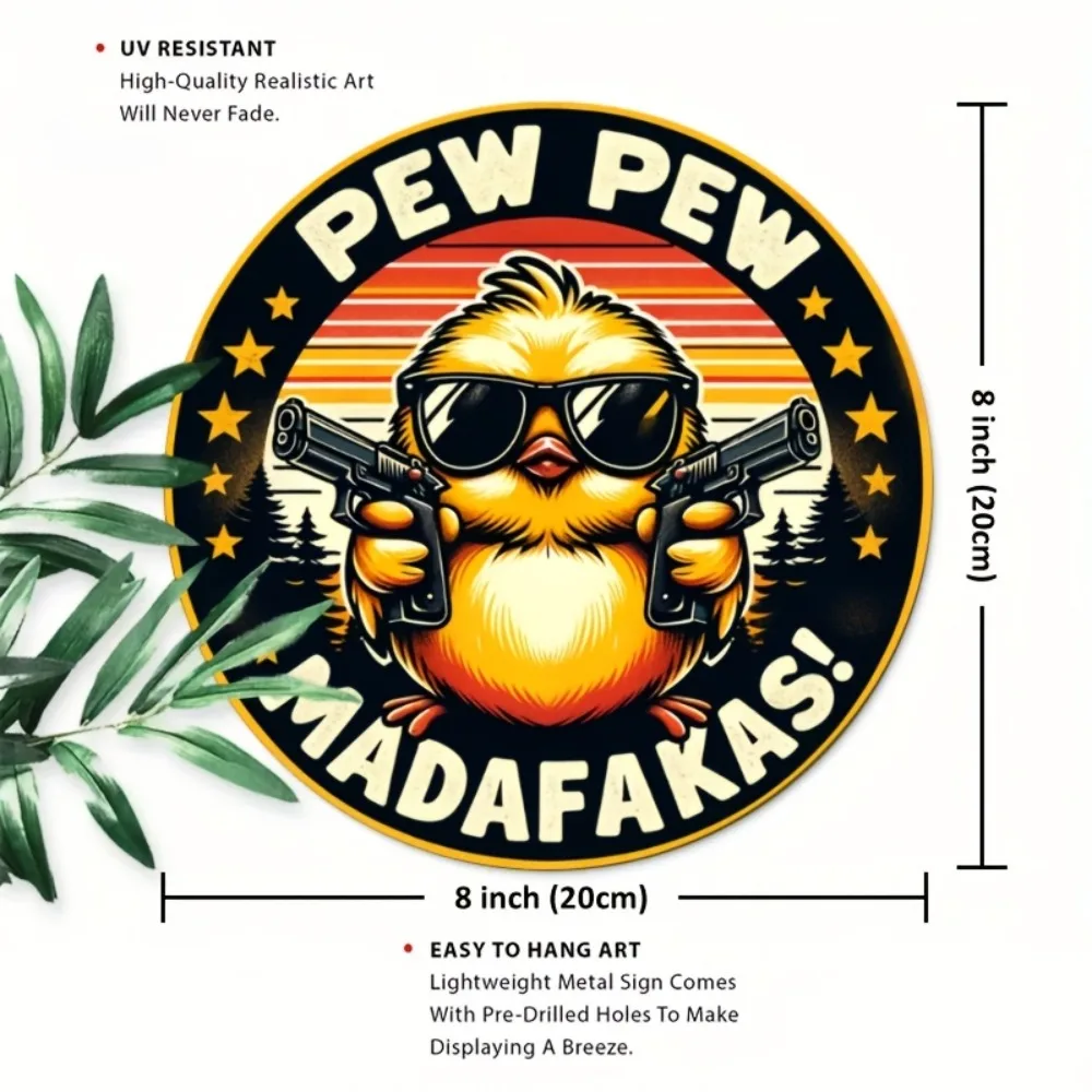 Transform your space with this bold and colorful “Pew Pew Madafakas” metal sign by HELLOYOUNG. Measuring 8×8″, this vintage-inspired aluminum piece is perfect for adding humor and personality to your home, bar, patio, or game room. Its bright sunset background with red, orange, and yellow stripes creates an energetic atmosphere, while the cartoon chick with sunglasses adds a playful touch. The black silhouette pine trees provide a natural outdoor vibe. With its easy-to-hang design featuring four pre-drilled holes, you can display it on your wall or table easily. This eye-catching decor invites smiles and conversations, making it an ideal gift or a standout addition to your casual decor.
