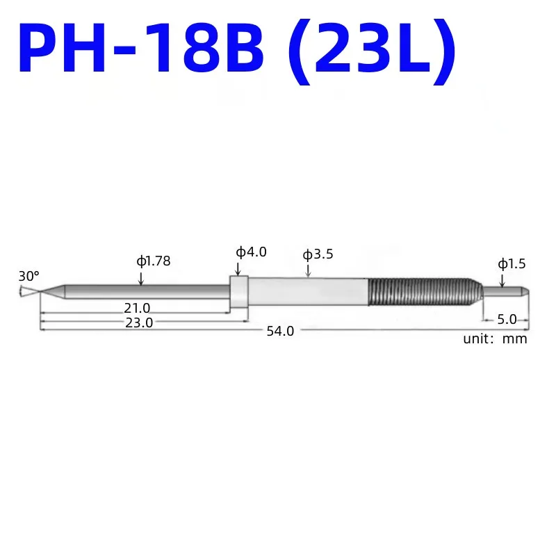 Experience seamless PCB testing with this set of PH-18B-23L spring test probes, designed to deliver high accuracy and durability. Each probe boasts a sleek, metallic finish with a highly polished, reflective shaft, ensuring a professional and industrial aesthetic. The textured, darker metallic ribbed section provides enhanced grip and flexibility, while the straight, sharp tip head with a diameter of 1.78mm ensures precise contact on contact points. With a total length of 54mm and an installation height of 23mm, these probes are ideal for detailed electronic testing in various applications. Their uniform design and high manufacturing quality guarantee consistent, reliable performance, making them a trusted choice for technicians and engineers alike. These probes are suitable for tasks requiring accurate, repeatable contact points on PCBs.