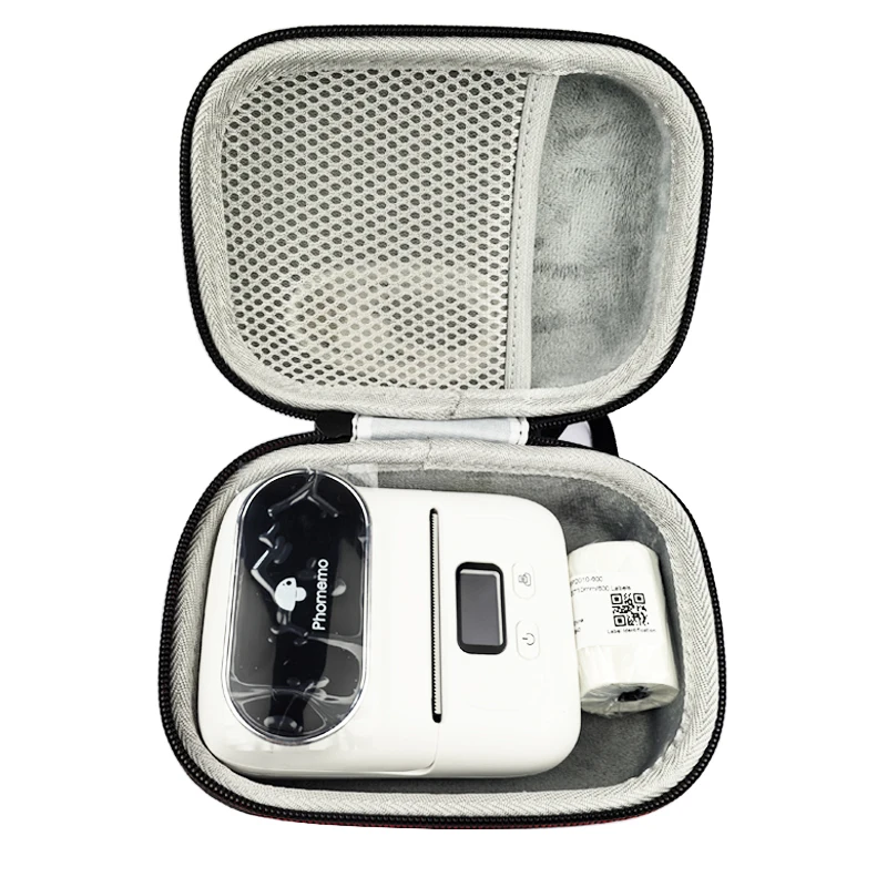 Protective and stylish, this black hard EVA travel case measures 157 x 117 x 75 mm and weighs 160 grams, specifically designed for the Phomemo M110 mini portable thermal label printer. Crafted from durable, waterproof, and shockproof EVA material, it offers heavy-duty protection with a premium high-quality villus lining inside. The case features a sturdy 360-degree zipper for easy access, a convenient hand strap for portability, and an interior mesh pocket to securely store accessories. Its sleek, compact design combines practicality with modern aesthetics, providing a lightweight, reliable solution for transporting your printer and essentials safely during outdoor activities or travel.