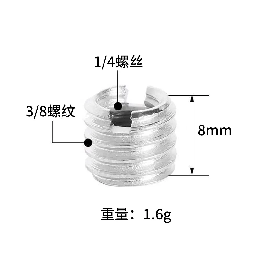 Experience seamless connectivity with this precisely crafted metal adapter, designed to enhance your photography setup. Finished with a shiny, chromium-plated surface, it offers wear resistance and durability, ensuring longevity. Its minimalist cylindrical shape features subtle grooves and a notch for easy locking, presenting an industrial yet sleek look. The adapter effortlessly converts a 1/4″ female screw to a 3/8″ male screw, making it perfect for attaching tripods, monopods, ball heads, light stands, or flash brackets. Compact at just 8mm in length and weighing only 1.6 grams, it’s lightweight and unobtrusive but highly functional. Whether in your studio or on-location, this adapter reliably secures your equipment with a professional finish.