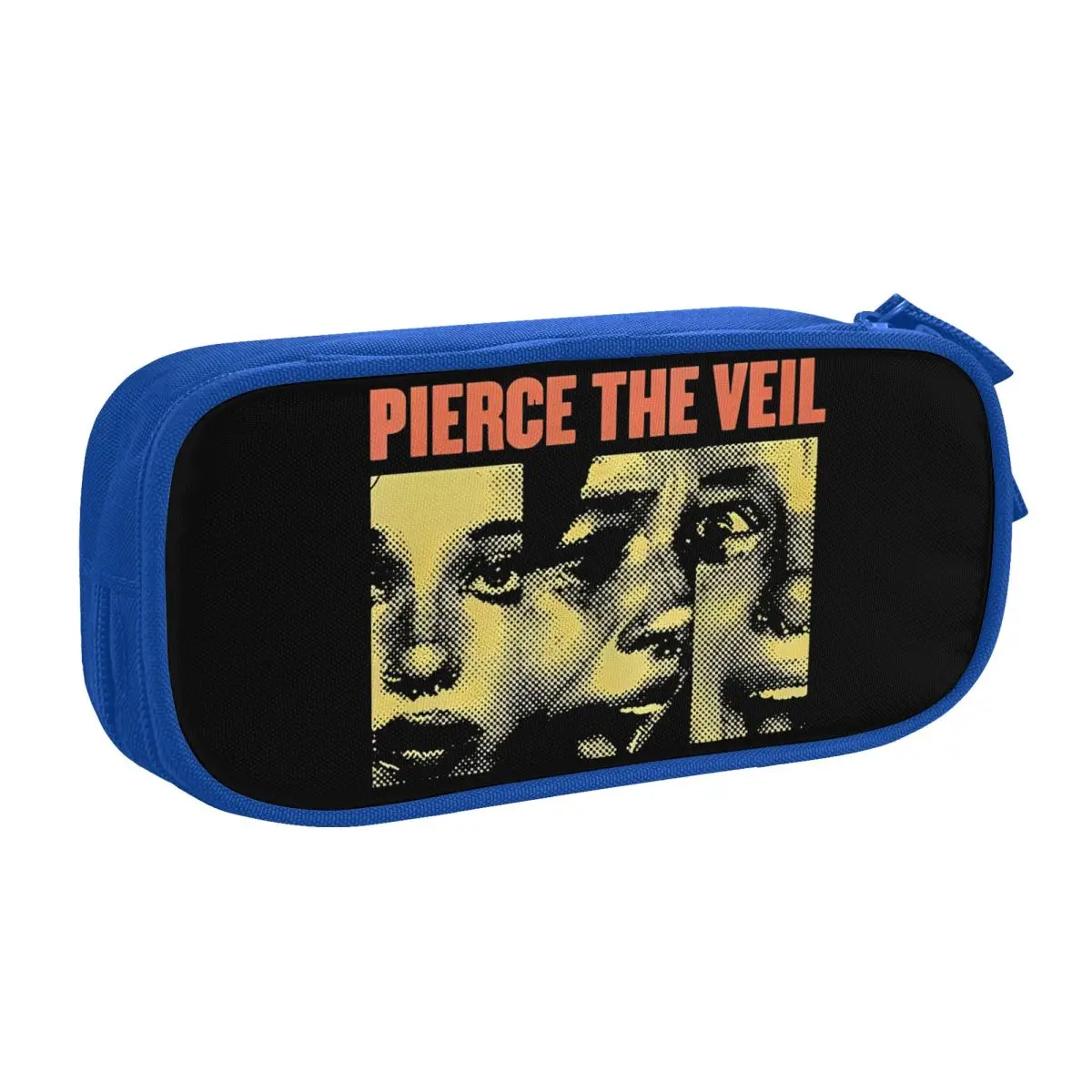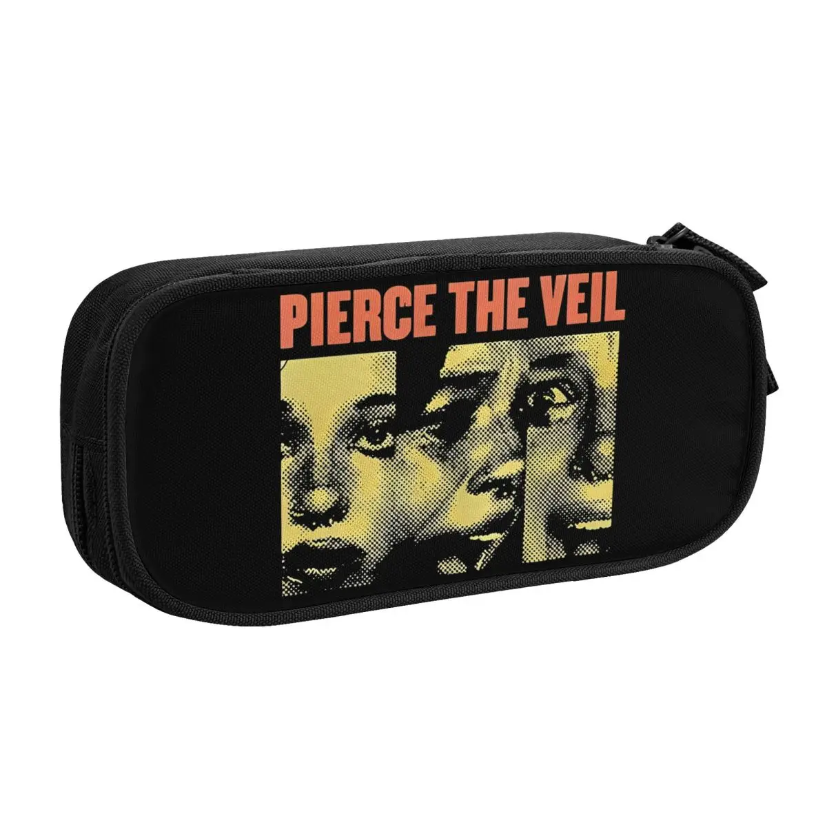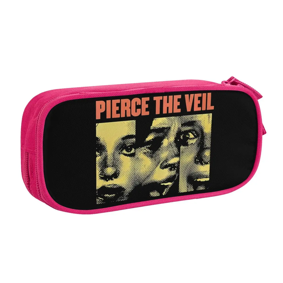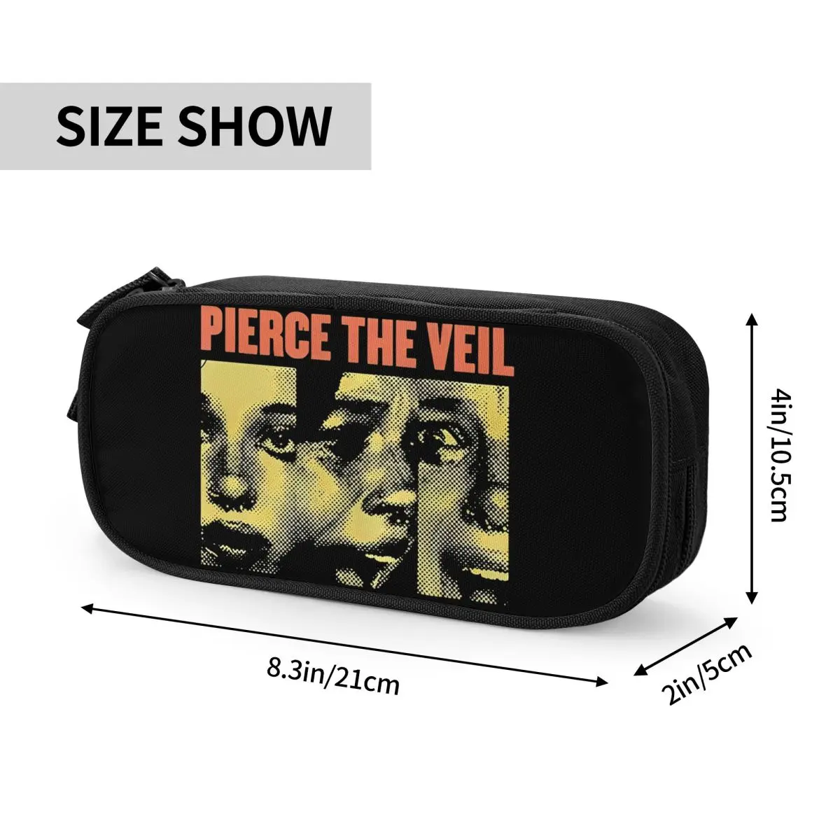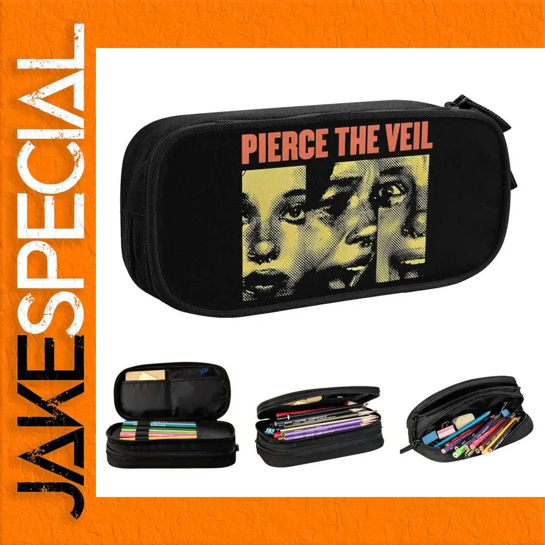 This eye-catching pencil case features a stunning black rectangular design with vibrant orange lettering, proudly displaying “PIERCE THE VEIL.” Below the text, artistic yellow monochromatic faces with a halftone effect offer a contrasting flair against the dark background, creating a trendy aesthetic. This high-capacity case is crafted from durable leather, ensuring not only style but also longevity for daily use. It boasts multiple compartments for organized storage, elastic bands to keep your pens and pencils secure, and a zipper closure that provides easy access. Perfect for students and professionals alike, owning this pencil case will elevate your stationery collection effortlessly.