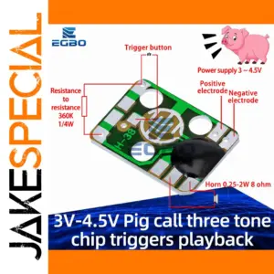 Trust this module to provide authentic pig call sounds reliably, whether you're developing animal call devices, electronic musical instruments, or hobbyist electronic projects. Its durable design and precise specifications make it an excellent choice for versatile applications. Once installed, you'll enjoy seamless operation and high-quality sound performance, elevating your DIY creations and professional prototypes alike. Choose this high-performance sound module today to elevate your electronic sound projects with confidence.