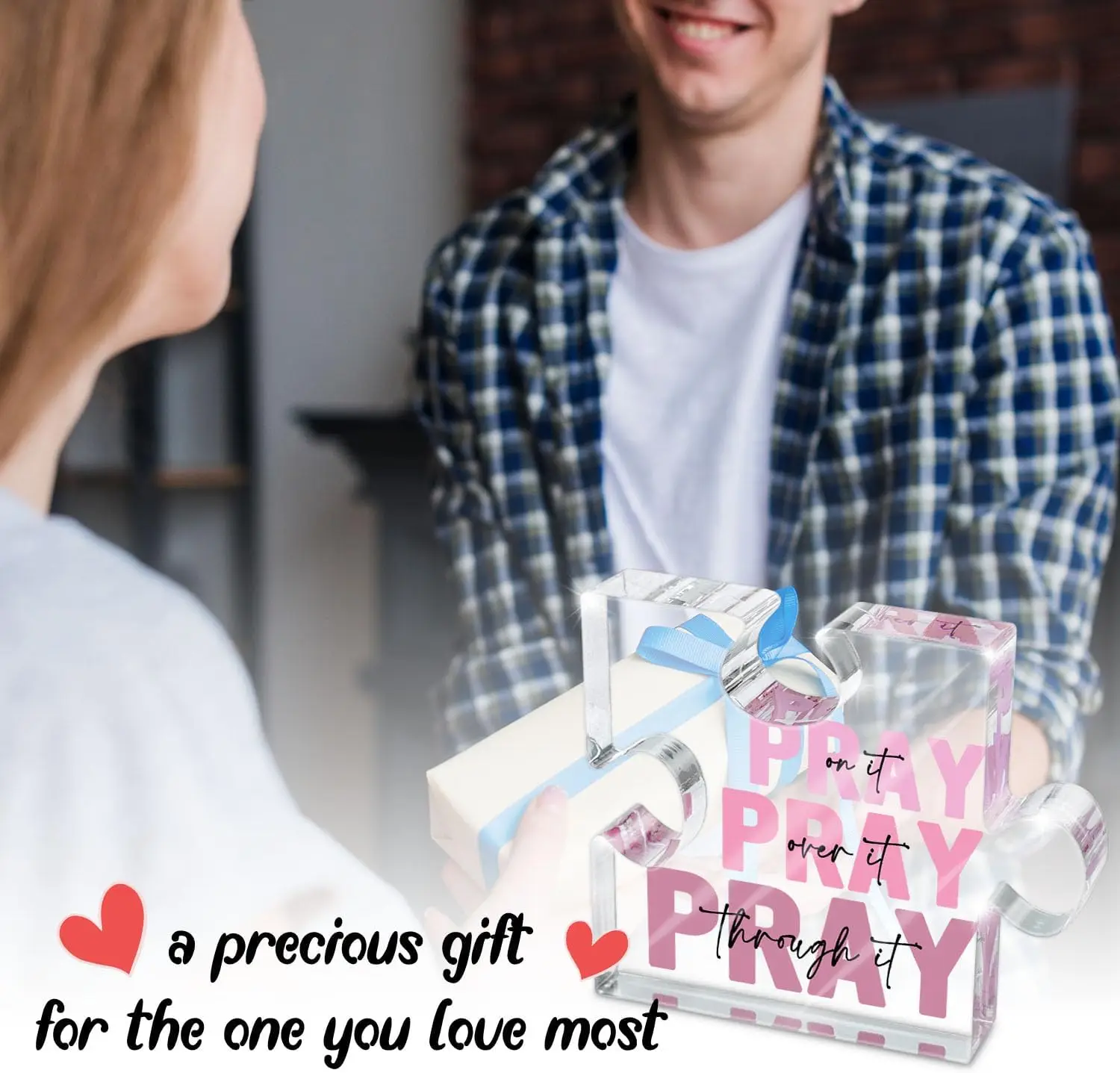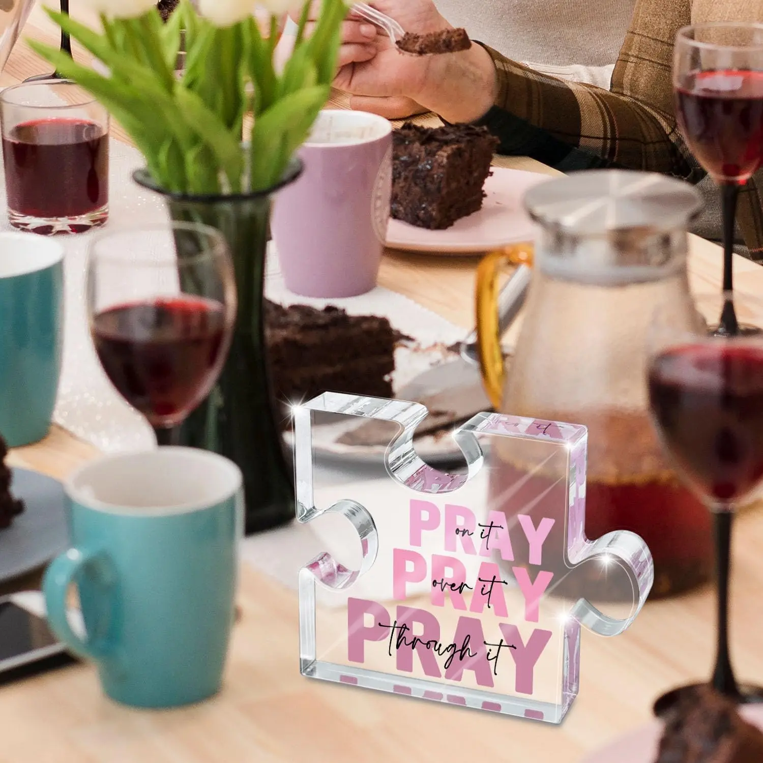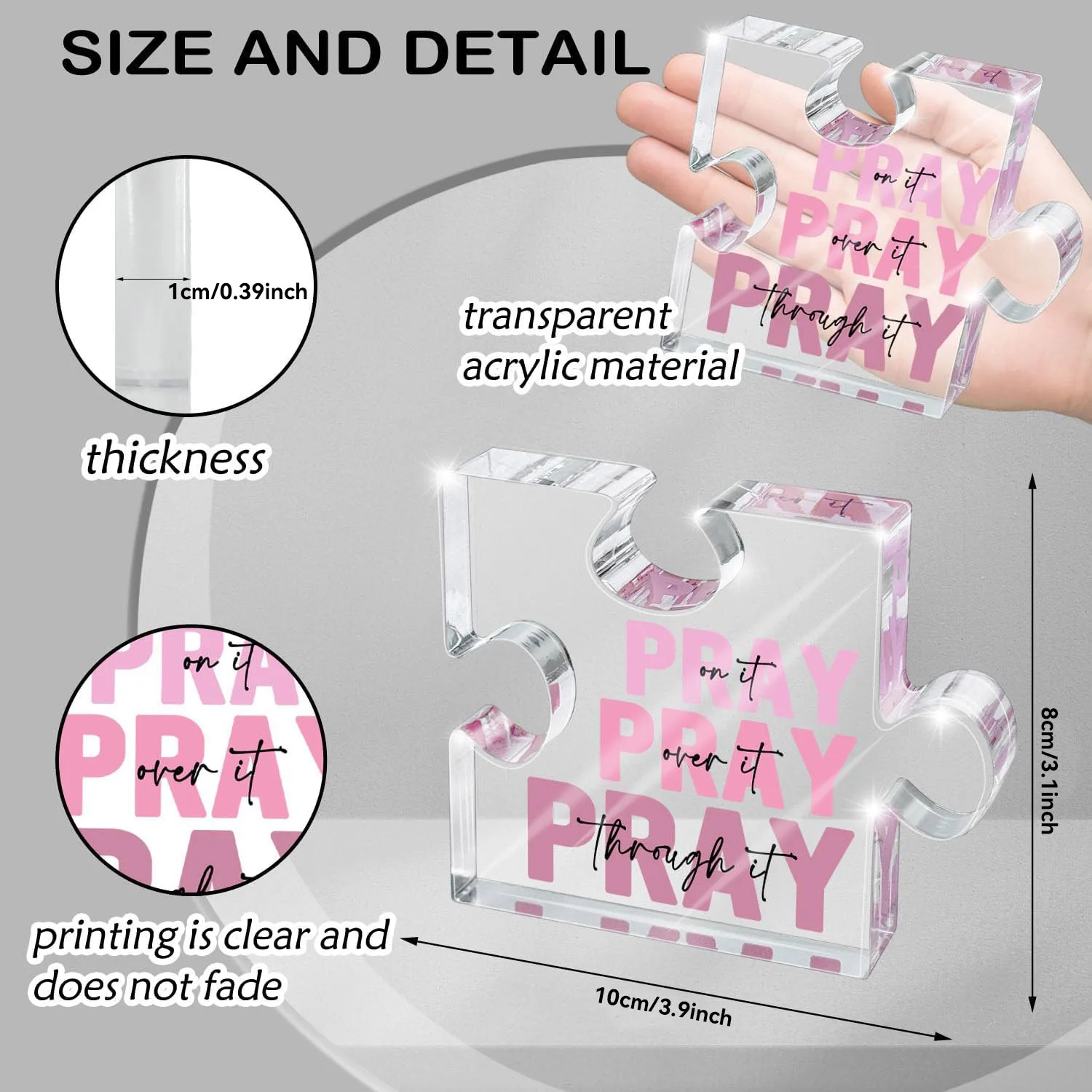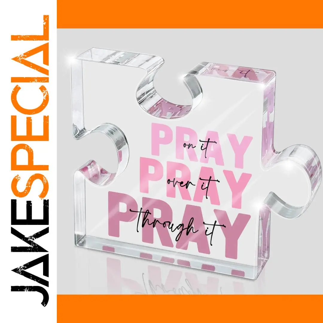 Enhance your workspace or gift this uplifting Christian-themed decor with this pink acrylic puzzle-shaped plaque. Crafted from durable, chemical-free plastic, it features the inspiring phrase “Pray on it, Pray over it, Pray through it,” with the word “Pray” in bold, solid pink uppercase and supporting black cursive text. The glossy surface reflects light beautifully, creating a subtle sparkle that adds brightness and positivity to any environment. Its modern, transparent design combines spiritual encouragement with contemporary style, making it an ideal office desk accessory or thoughtful gift for those who cherish faith and reflection.