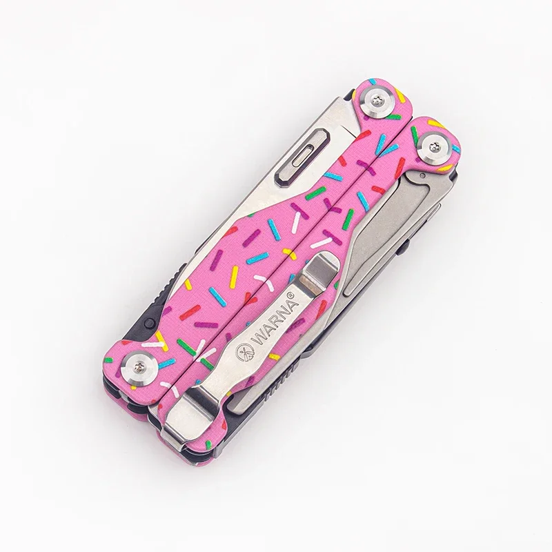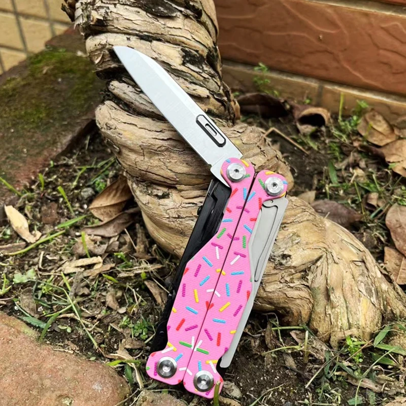 - The multitool is available in multiple color variants, including camouflage, green, orange, and pink, each featuring the same playful sprinkle pattern for a fun, vibrant look.