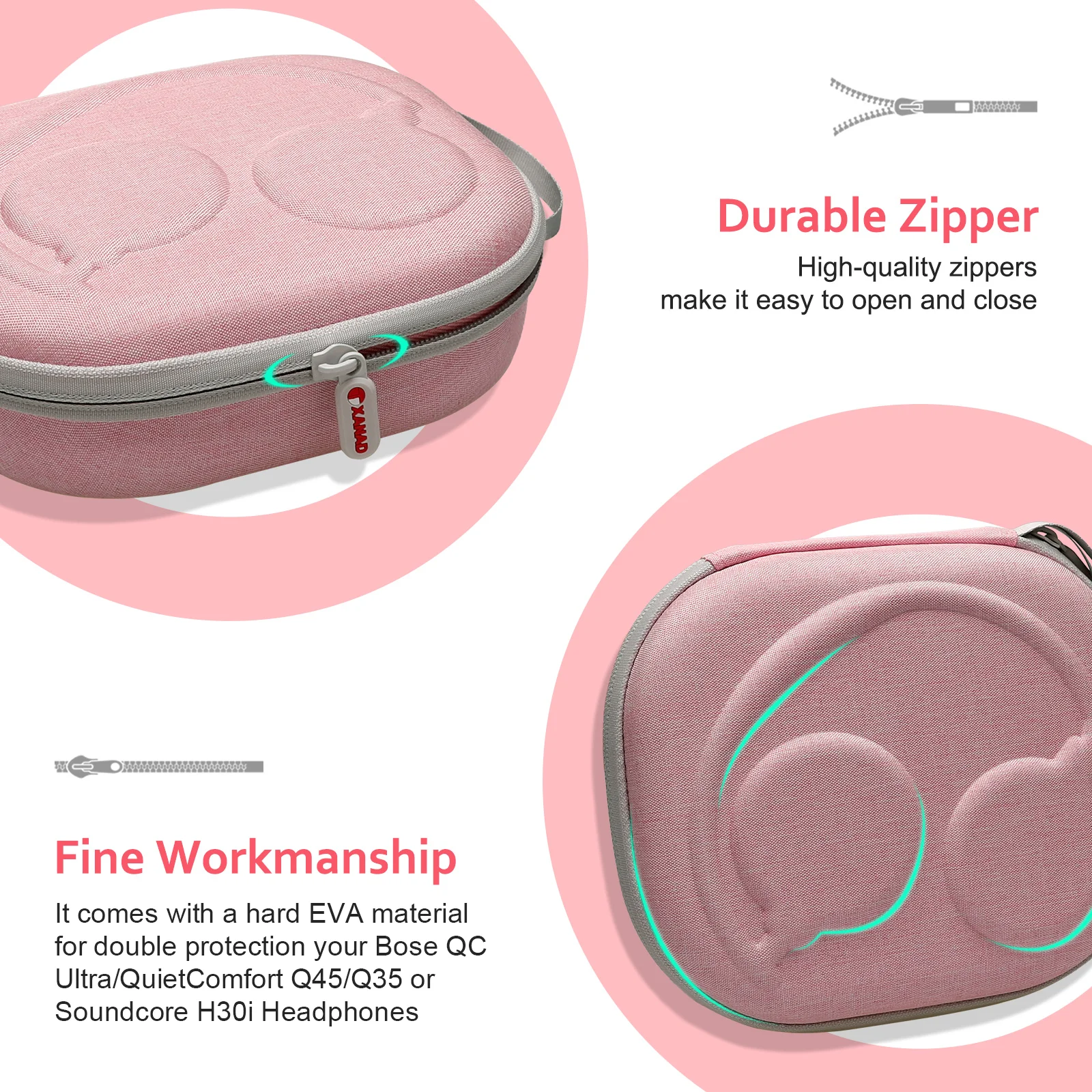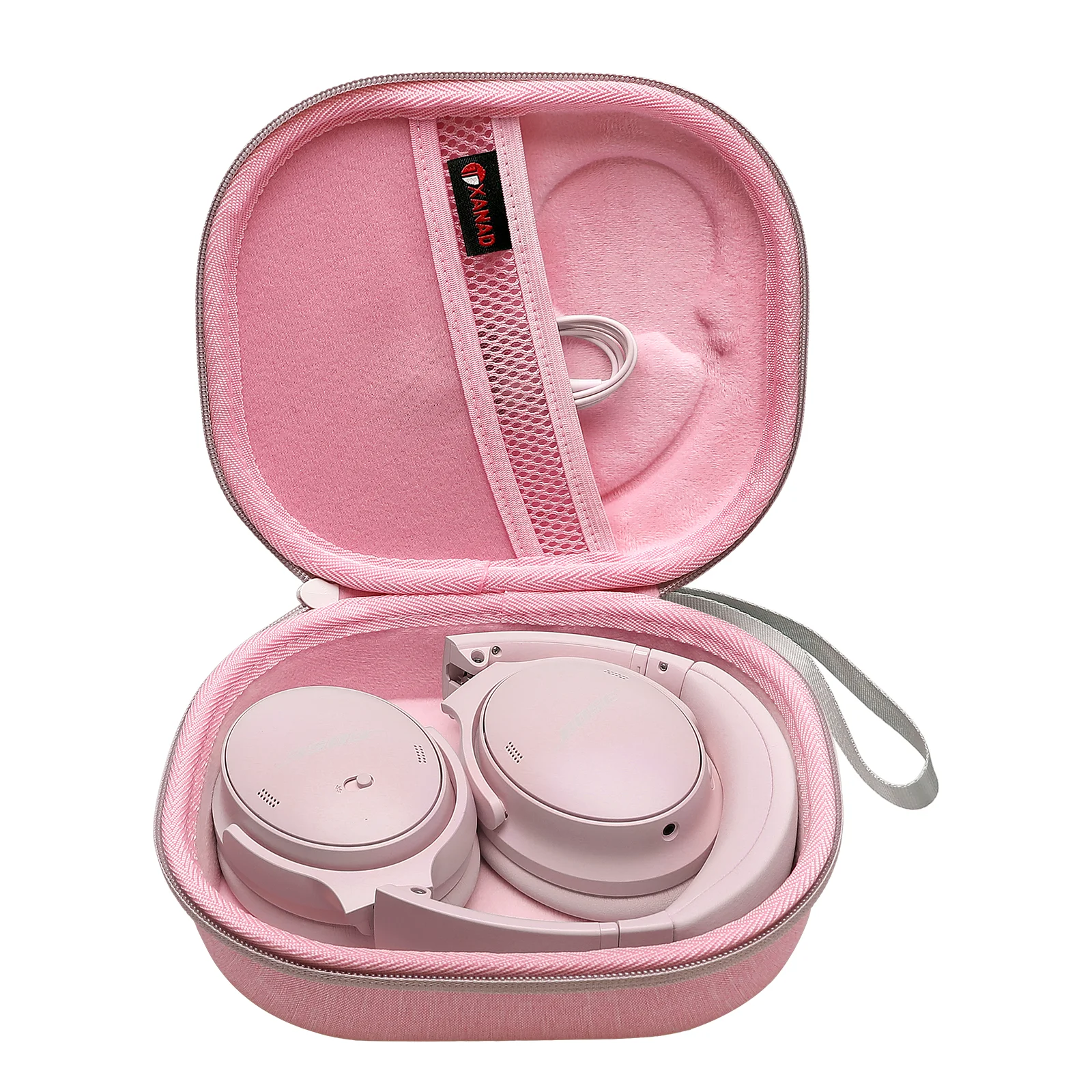 - Product specifications: EVA exterior, soft plush interior, zipper closure, dimensions tailored to Bose QuietComfort headphones, pink color, includes only the case.