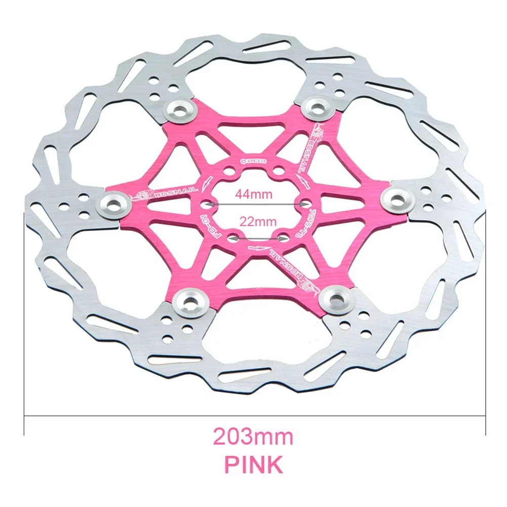 Experience the perfect blend of style and performance with this this pink floating disc brake designed for mountain biking enthusiasts. Crafted from high-strength steel and lightweight aluminum alloy, it offers exceptional durability while maintaining a sleek, eye-catching appearance. The bright pink color on the aluminum spider and center mounting area provides a bold aesthetic, ideal for customizing your ride. The high-quality steel braking surface is smooth and slightly grooved, ensuring excellent heat dissipation and stable braking even during intense rides. Available in three sizes—160mm, 180mm, and 203mm—this disc is versatile and compatible with many mountain bikes. The hollow heat dissipation design keeps your brakes cool, preventing overheating. Its lightweight structure and modern visual appeal make it a standout upgrade for your bicycle.