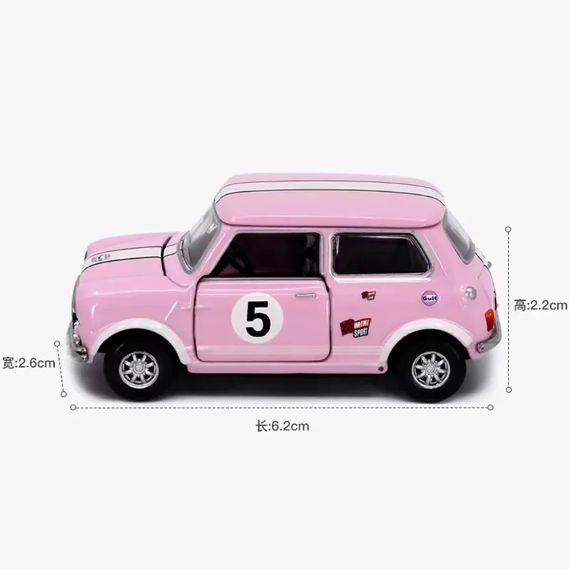 Enhance your collection with this intricately crafted diecast model of the Mini Cooper Mk 1, scaled at 1:50 and measuring 6.2×2.6×2.2 cm. Made from durable alloy, it features a vibrant pink finish with black and white racing stripes, a classic round headlight design, and detailed interior visible through transparent windows. Perfect for static display and decoration, this fragile model is intended for adult collectors aged 14 and above, requiring self-gluing if parts detach. Its glossy, metallic surface captures the vintage charm of the iconic Mini Cooper, making it a striking addition to any collection or display.