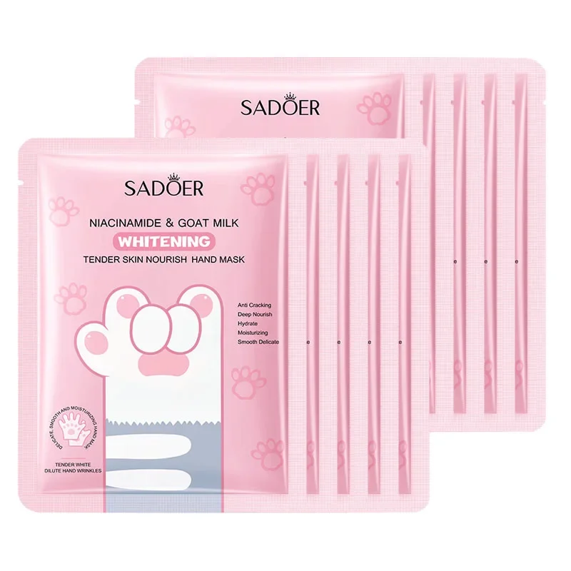 Imagine pampering your hands with this beautifully designed pink hand mask, which offers a nourishing and hydrating experience. The soft pink, glossy sachets reflect light subtly, enhancing their delicate and feminine appeal. Each mask, featuring a charming paw print illustration, provides deep moisture, anti-wrinkle, and whitening benefits, making your skin softer, brighter, and more youthful. Perfect for relaxing at home, this hand mask fits seamlessly into your skincare routine, offering a tender touch of care that leaves your hands feeling renewed and radiant. With a beautiful minimalist aesthetic, it appeals to those who appreciate elegance and self-care. Indulge in this luxury and turn your hand care into a calming ritual that boosts your confidence daily.