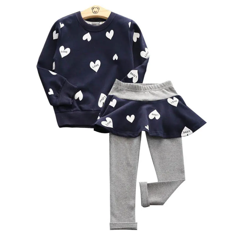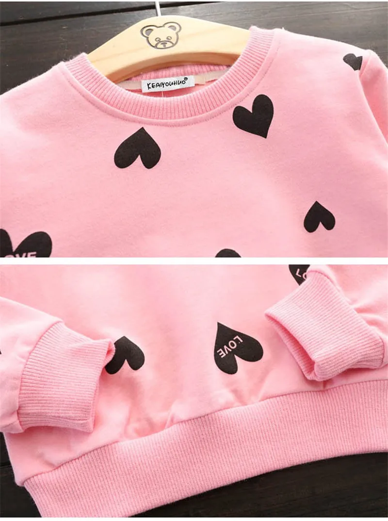 - Includes a long-sleeve T-shirt with playful black heart patterns and “LOVE” inscriptions, adding a fun, fashionable touch.