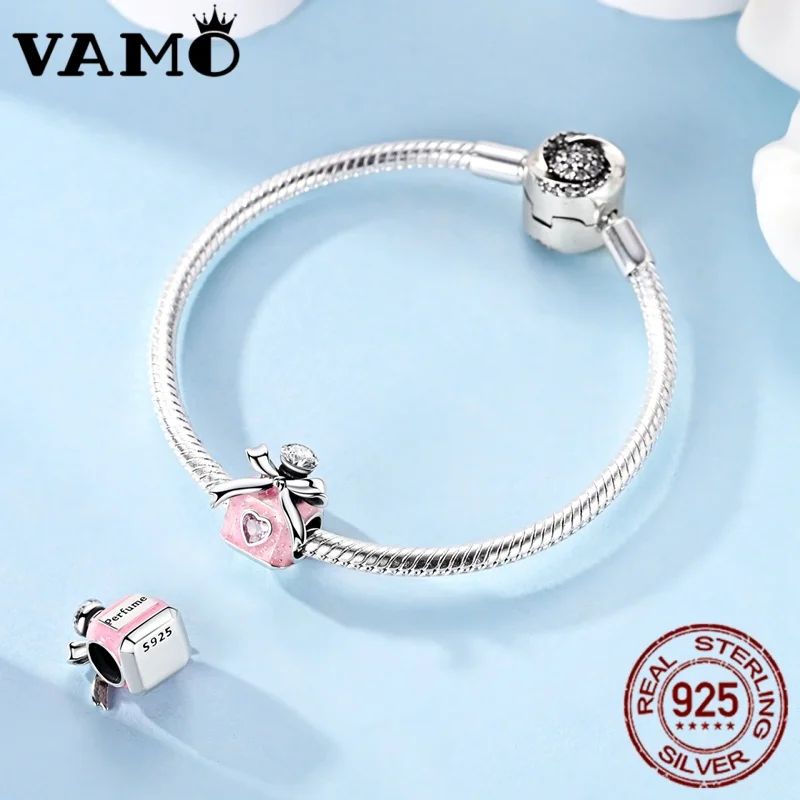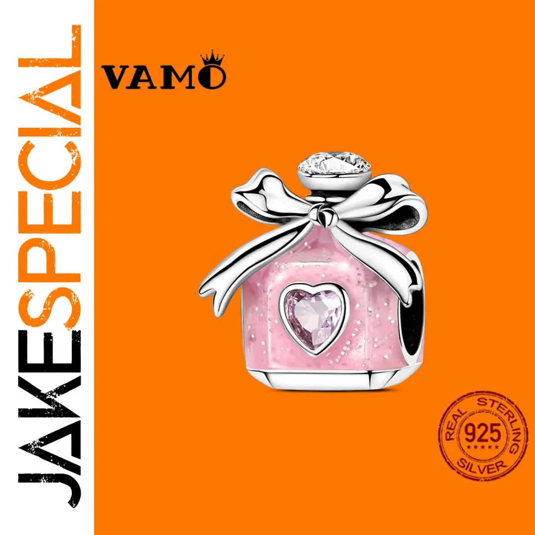 Imagine adding a touch of femininity and luxury to your jewelry collection with this stunning perfume bottle charm. Crafted from high-quality 925 sterling silver, it features a delicate, glossy pink enamel finish with a subtle, translucent hue embedded with tiny sparkles or glitter for added shimmer. The design resembles a small, rounded rectangular perfume bottle with a silver cap, a graceful bow at the top, and an embedded silver heart outlined with a faceted light pink zirconia that catches every light. The charm radiates elegance, combining floral and gift-like charm elements. Its detailed craftsmanship ensures it will become a treasured addition to your bracelet, reflecting your unique style and personality.