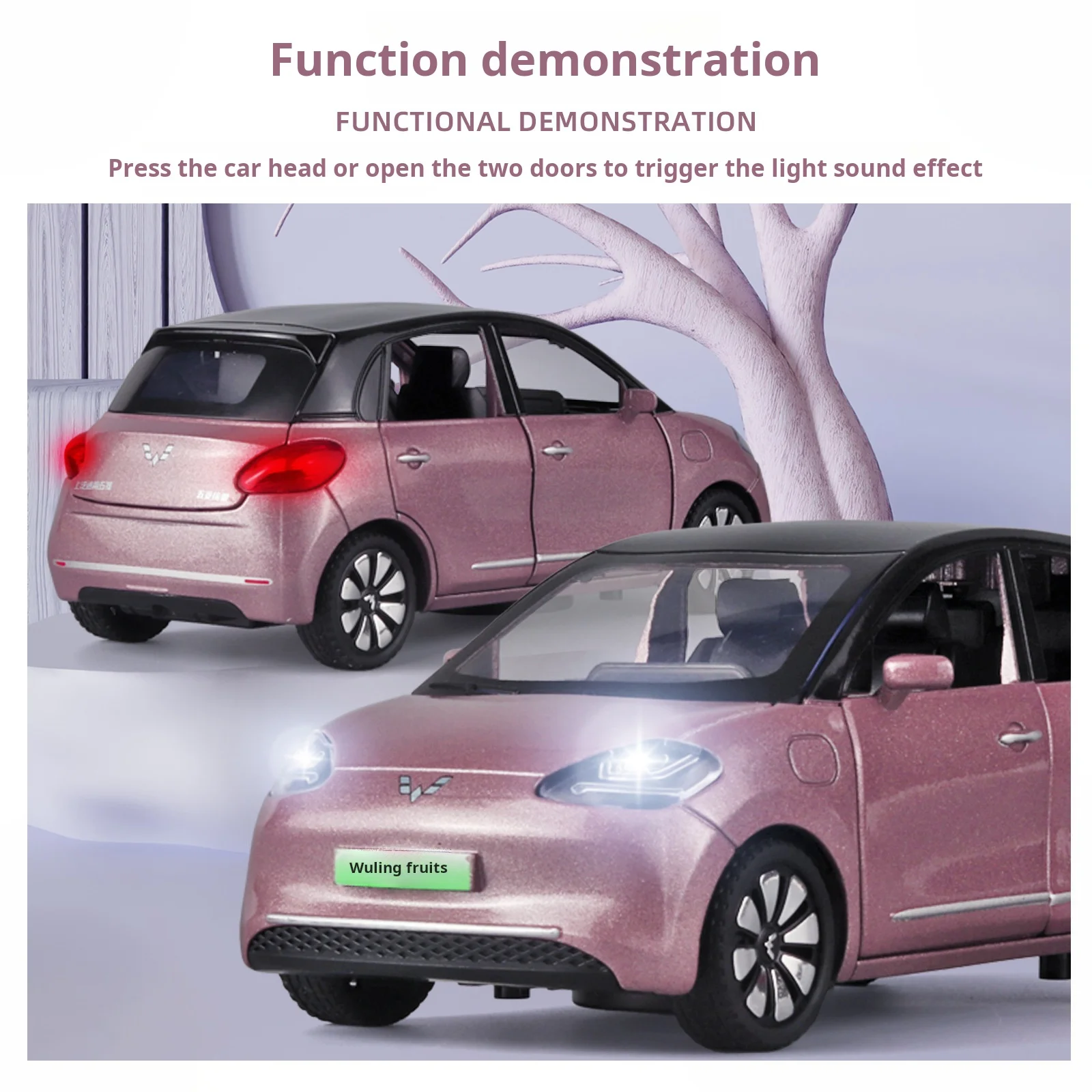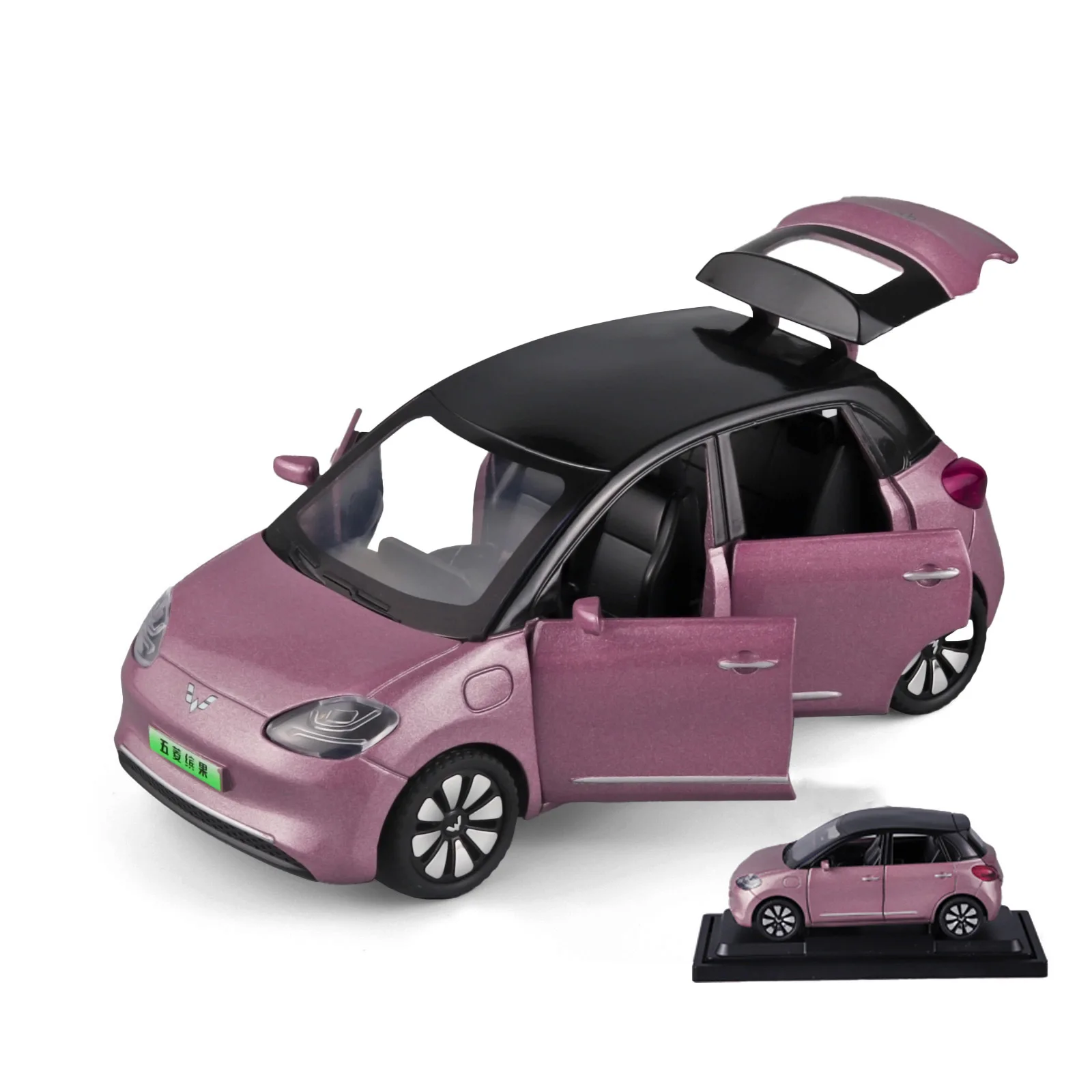 Experience the thrill of owning this stunning pink Wuling Bingo 1:32 scale alloy model. With its shiny, metallic finish, this compact hatchback exudes sporty elegance. Its sleek, rounded design features detailed headlights with intricate inner details, a subtle grille, and contrasting black roof to enhance its dynamic look. The black alloy wheels with white accents perfectly mimic real car rims, adding to its realistic appearance. The model's slightly open doors reveal a simplified interior with seats and steering wheel, giving you a glimpse inside. Equipped with integrated sound and light effects, it offers an immersive experience. Whether displayed as a collectible or used as a fun toy, this model combines style, functionality, and durability for adult enthusiasts and passionate collectors alike.
