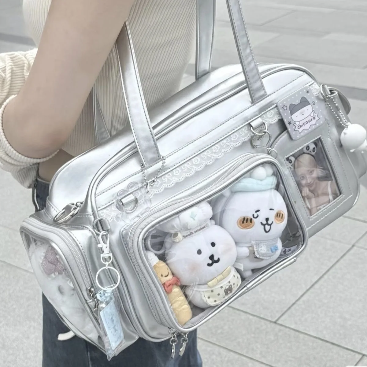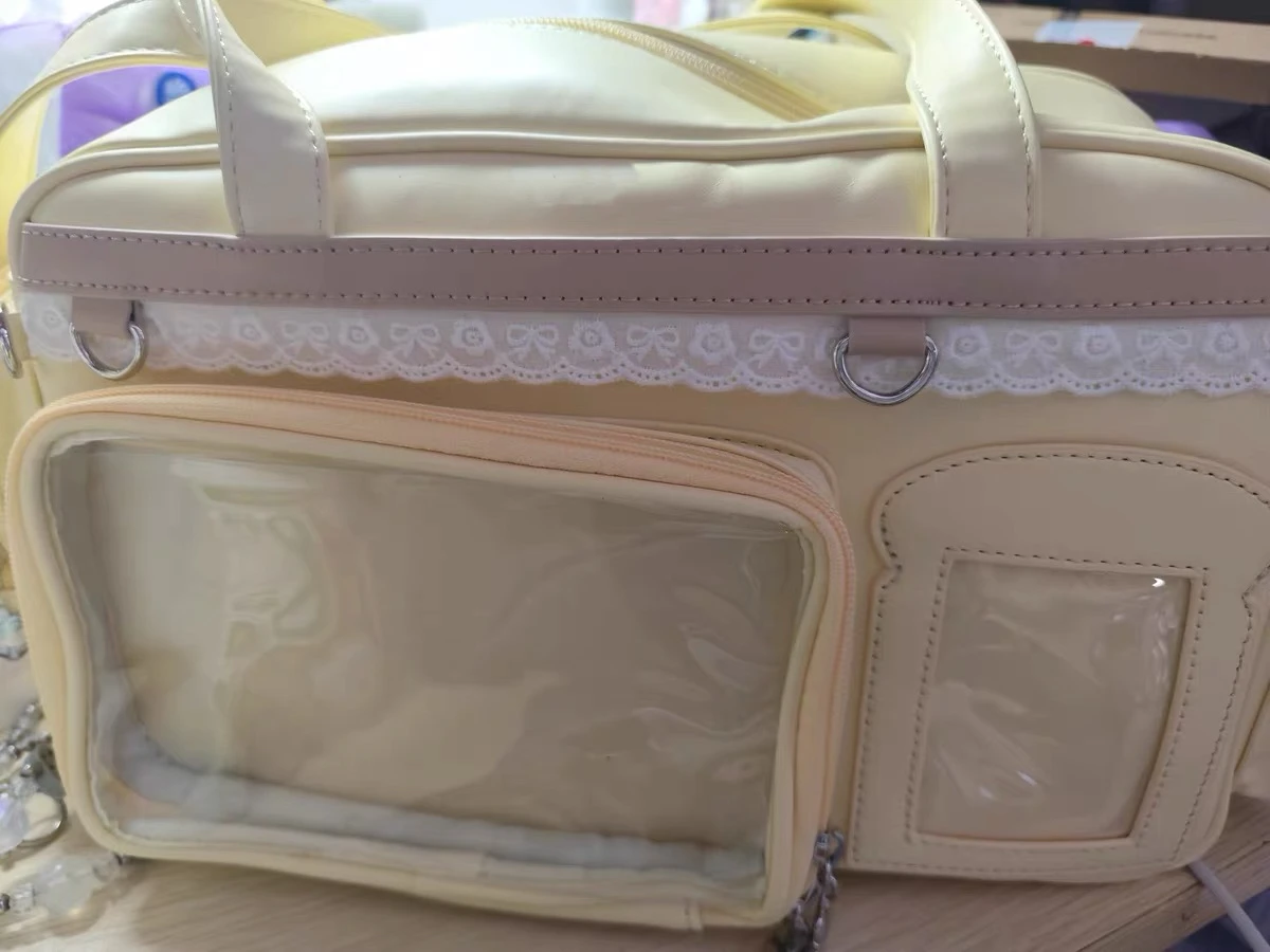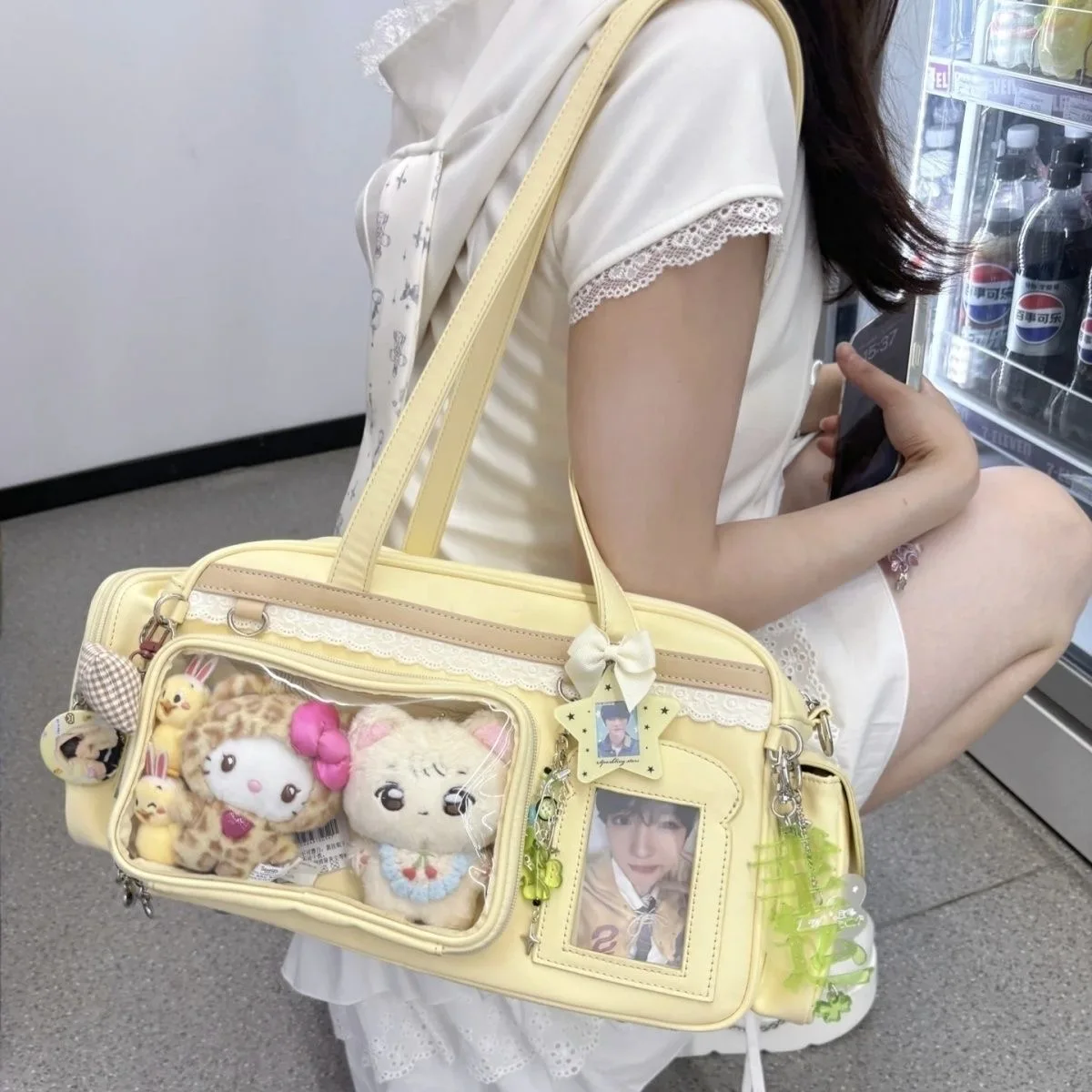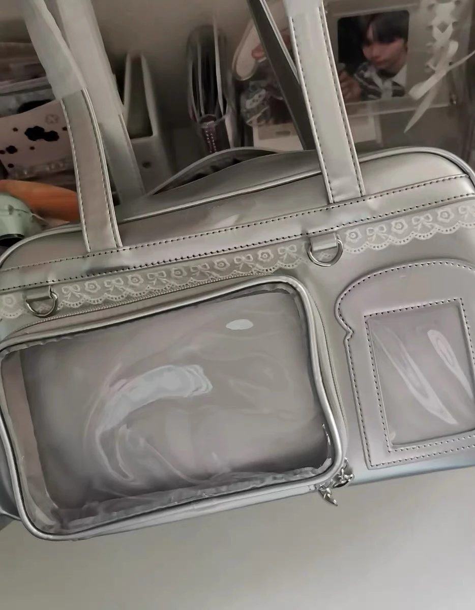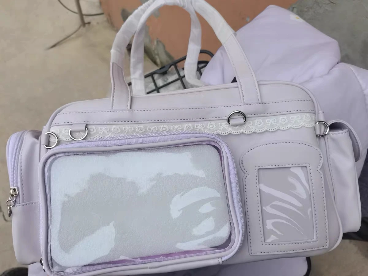 Experience the playful and trendy Y2K-inspired style with this large capacity transparent Ita bag, measuring 39x20x14cm. Crafted from eco-friendly PU material with a polyester lining, it offers versatile wear as a shoulder, backpack, or crossbody bag thanks to two adjustable straps. Its spacious interior features slot and cell phone pockets, perfect for daily essentials. Available in vibrant colors including purple, blue, yellow, silver, and pink, its minimalist design is accented with a plush Hello Kitty figure and small decorative accessories, creating a kawaii, youthful look ideal for casual, shopping, travel, or party occasions.
