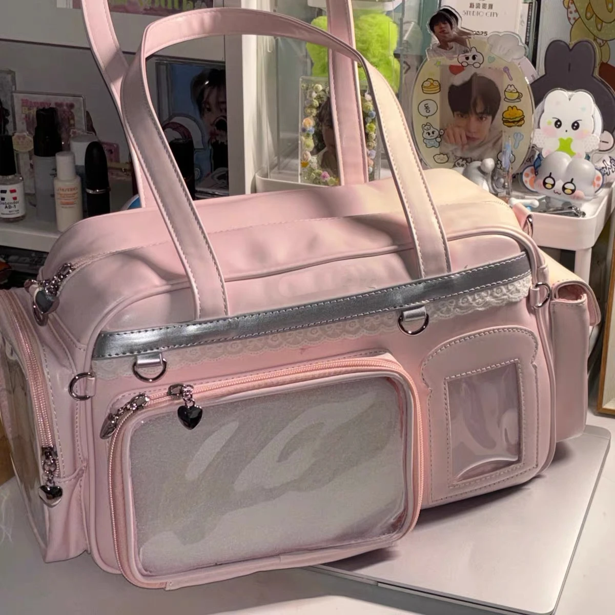 Pink Y2K Transparent Ita Bag with Plush Accessories