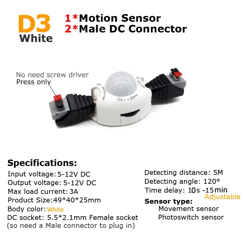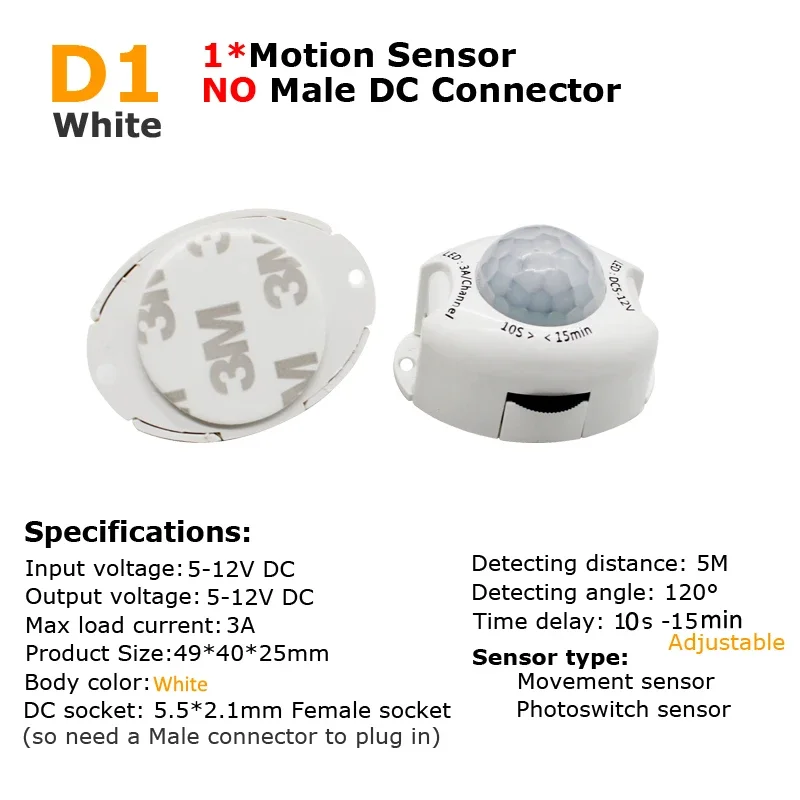 Experience seamless lighting control with this sleek PIR motion sensor switch, designed to enhance your space's automation effortlessly. Crafted from durable white plastic, the sensor features a rounded, textured lens that subtly blends into modern interiors. Its compact size (49mm x 40mm x 25mm) allows for unobtrusive placement in various indoor environments, whether installed under cabinets, in closets, or for night lighting. The sensor’s adjustable timer from 10 seconds to 15 minutes gives you customizable lighting duration, and its detection range of 1-5 meters ensures reliable motion sensing within a wide 120-degree field. Simple installation with 3M adhesive makes it user-friendly, making your lighting smarter, more responsive, and energy-efficient.