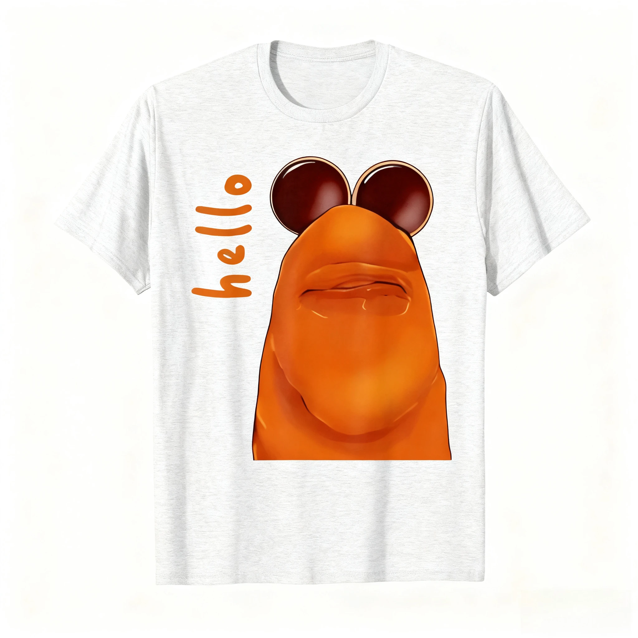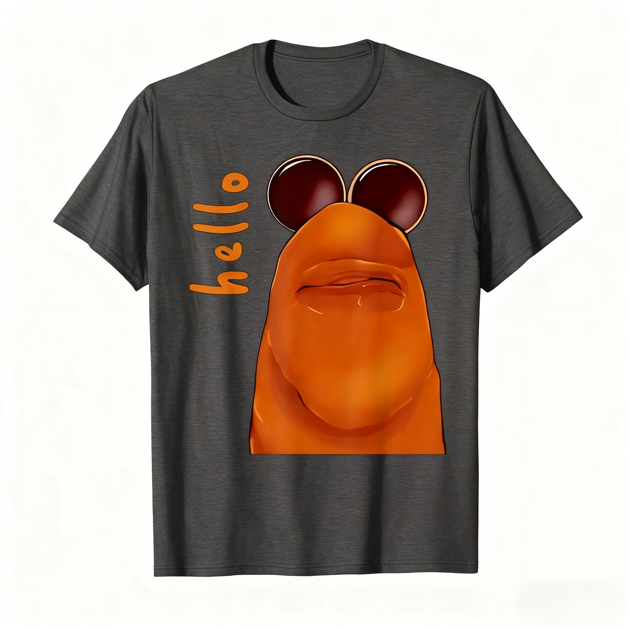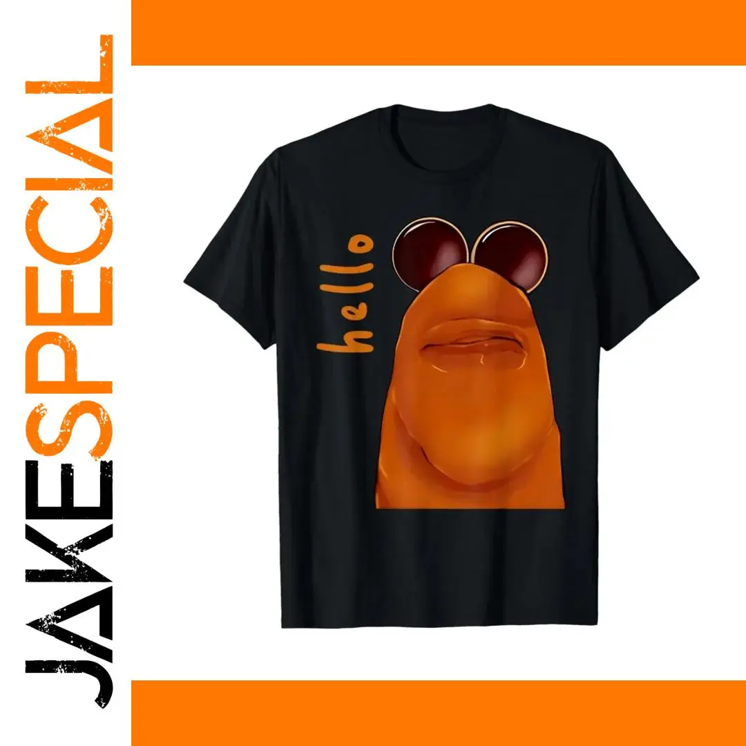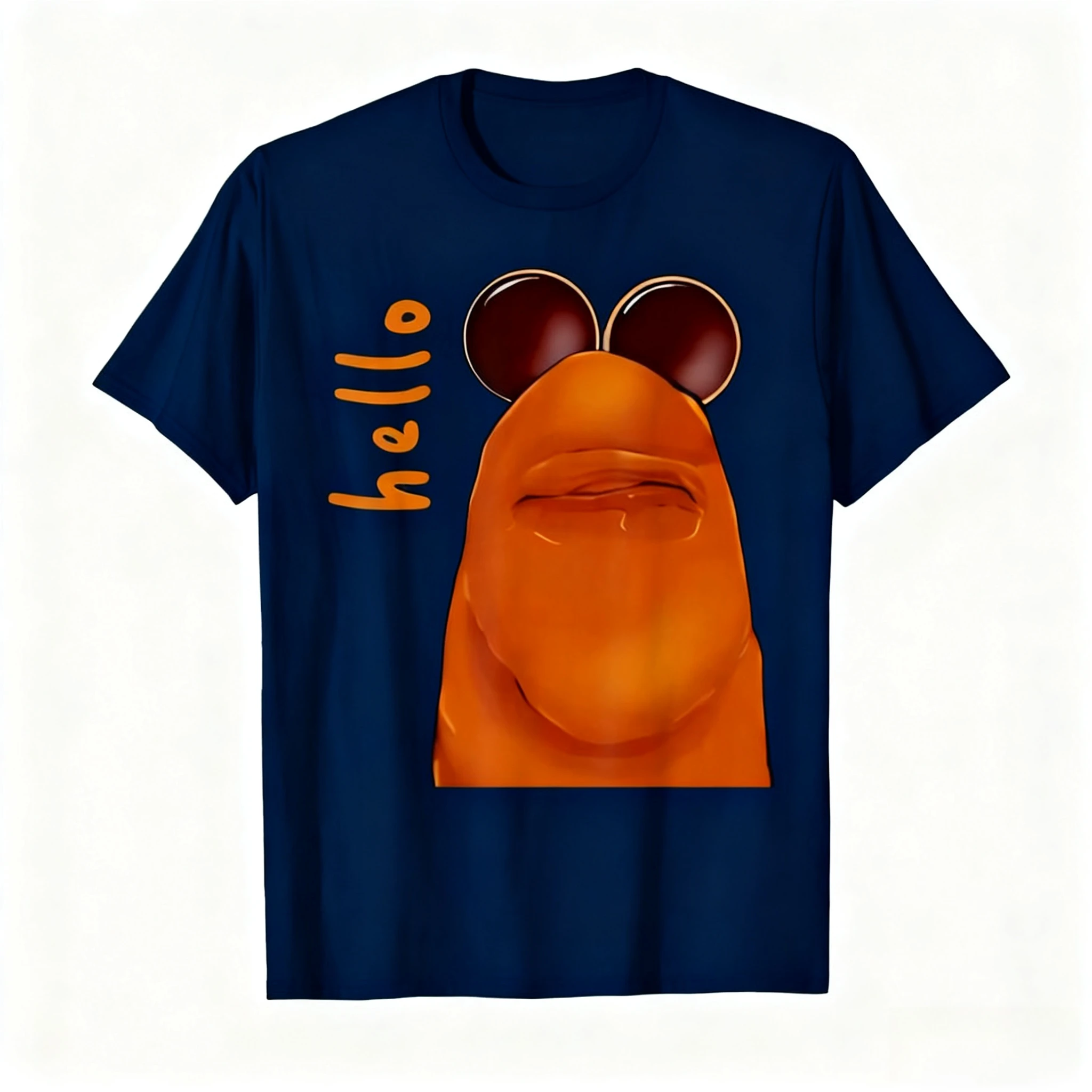 Imagine yourself wearing this striking black cotton T-shirt, instantly catching everyone's attention with its vibrant and humorous design. The colorful graphic depicts a shiny, cartoon-style hot dog in bright orange, accessorized with oversized, round sunglasses with dark lenses and golden rims, adding a fun and whimsical element. Vertical orange text reading “hello” to the side enhances the casual vibe. Crafted from 100% breathable cotton, this lightweight T-shirt offers supreme comfort for any season. Its classic crew neckline and relaxed fit make it perfect for daily wear, whether you're out with friends or enjoying casual moments. Embrace humor and modern style with this eye-catching piece that showcases your playful personality.