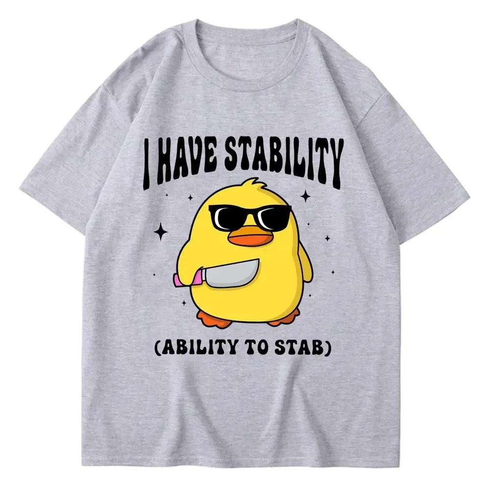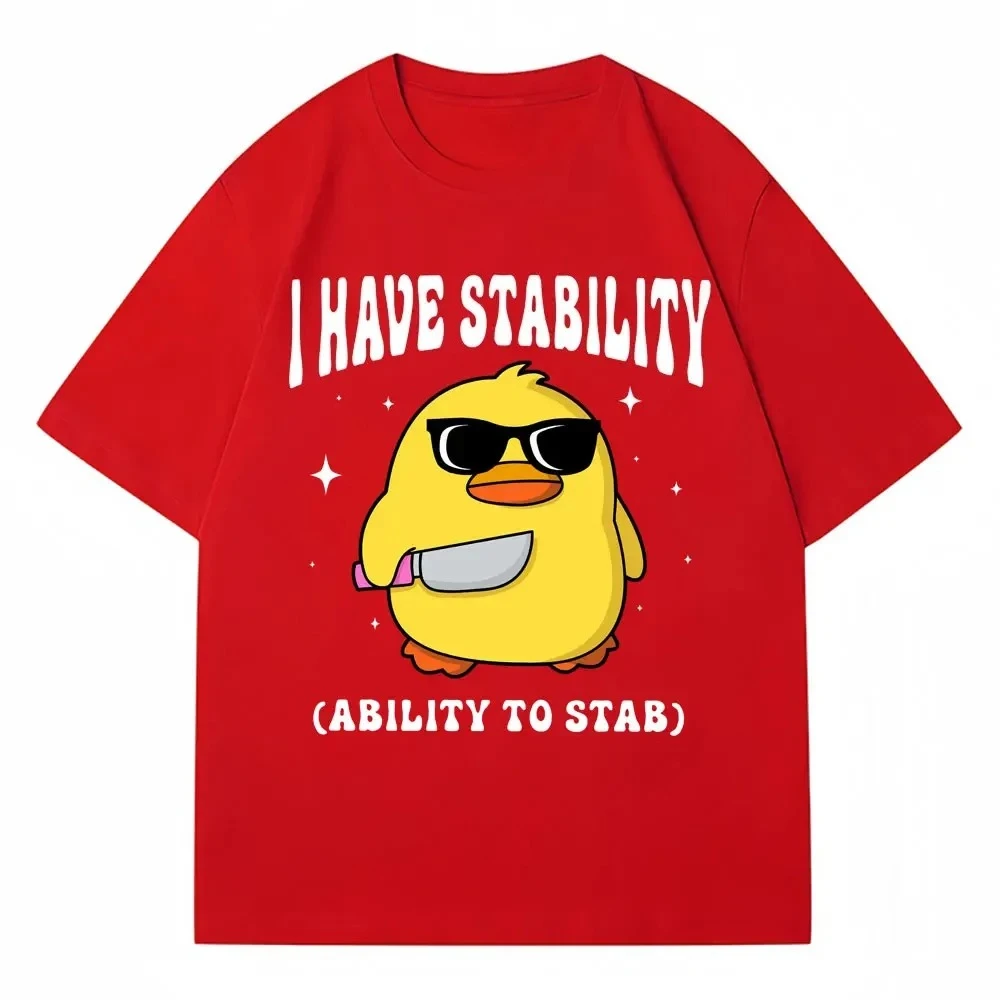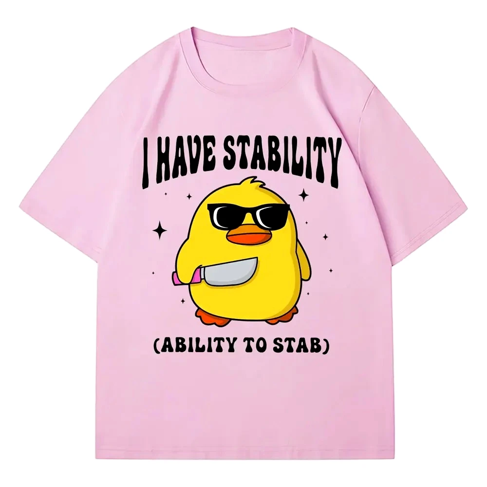 Imagine yourself confidently wearing this trendy white T-shirt, featuring a lively cartoon-style graphic that instantly catches the eye. The adorable yellow duck, sporting sleek black sunglasses, exudes a cool and humorous vibe perfect for streetwear or casual outings. Surrounding the duck are tiny black stars and sparkles that add a whimsical, fun touch to your look. The bold, curved black uppercase text “I HAVE STABILITY” and “(ABILITY TO STAB)” emphasize meme humor, making it a conversation starter. Crafted from breathable, lightweight cotton, this T-shirt guarantees comfort throughout the year, whether for a hot summer day or layered during cooler seasons. Its casual style pairs well with jeans or shorts, perfect for everyday wear or social gatherings. Elevate your wardrobe with a fun, edgy piece that showcases your personality effortlessly.