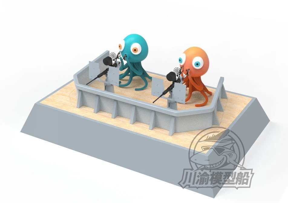 Imagine adding a lively, cartoon-inspired scene to your model display with this detailed octopus figure set. Featuring two stylized octopus characters brought to life with vibrant teal and bright orange colors, their exaggerated, large eyes and smooth, rounded bodies create a friendly, animated vibe. They sit confidently on a ship-like platform made of textured wood, with a sleek grey railing and detailed support structures, offering a realistic yet playful maritime touch. Small grey control panels sit beside each octopus, hinting at a recording or broadcast setting. Perfect for ocean-themed dioramas or whimsical tabletop models, this scene combines craftsmanship with charming character design, elevating your collection with fun, artistic details. Crafted in a bright, well-lit style, it’s ideal for enthusiasts who enjoy unique, character-driven models.