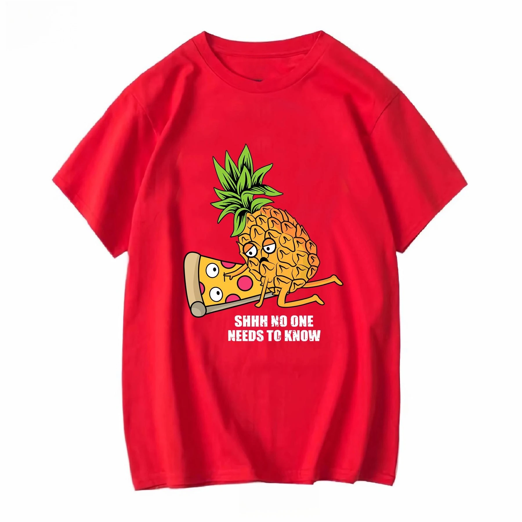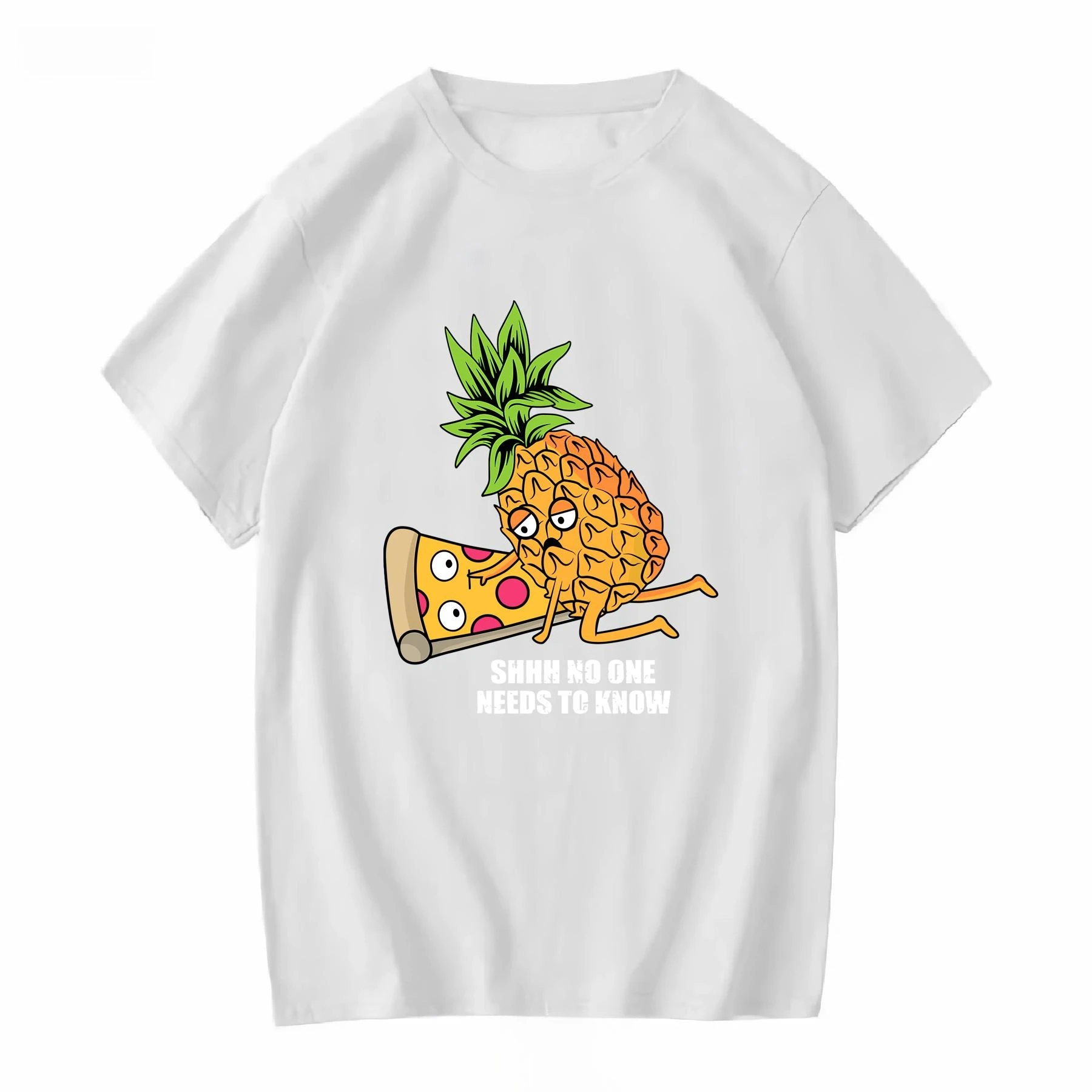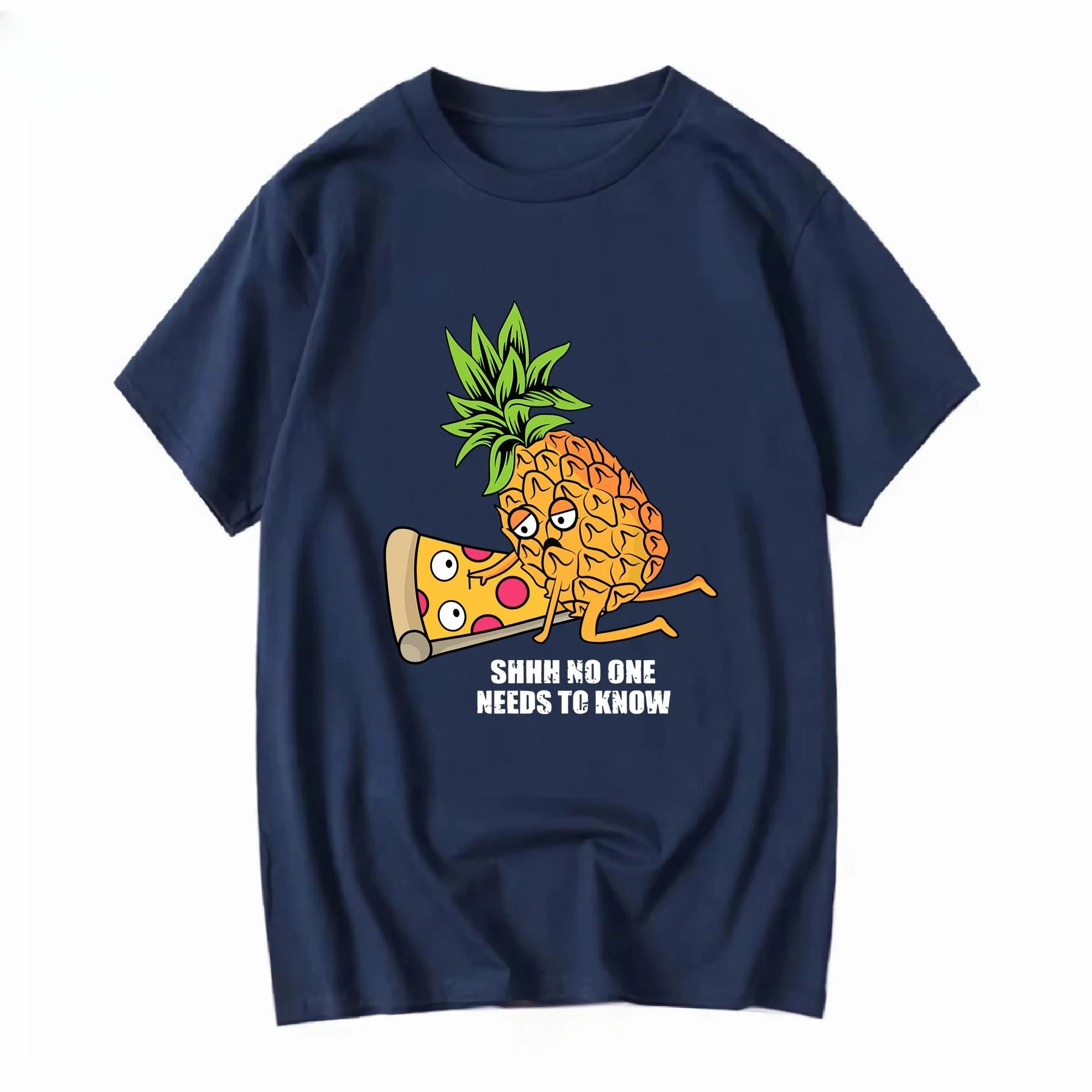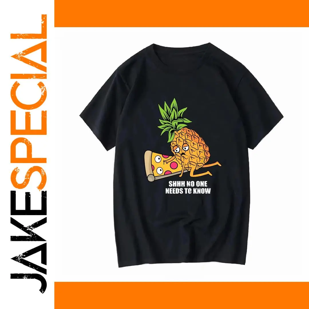 Experience the perfect blend of humor and casual style with this vibrant graphic T-shirt. Crafted from breathable cotton, it keeps you comfortable year-round. The playful design features a lively cartoon pineapple with orange body and jagged green leaves, paired with a humorous pizza slice with cartoon eyes, a mouth, and a tongue sticking out. The bold white text “SHHH NO ONE NEEDS TO KNOW” adds a humorous touch. Its colorful, eye-catching graphic stands out beautifully against the classic black background. The T-shirt's short sleeves, crew neckline, and soft knit texture make it ideal for any casual occasion. Whether you're relaxing at home or out with friends, this shirt lets you showcase your fun personality effortlessly.