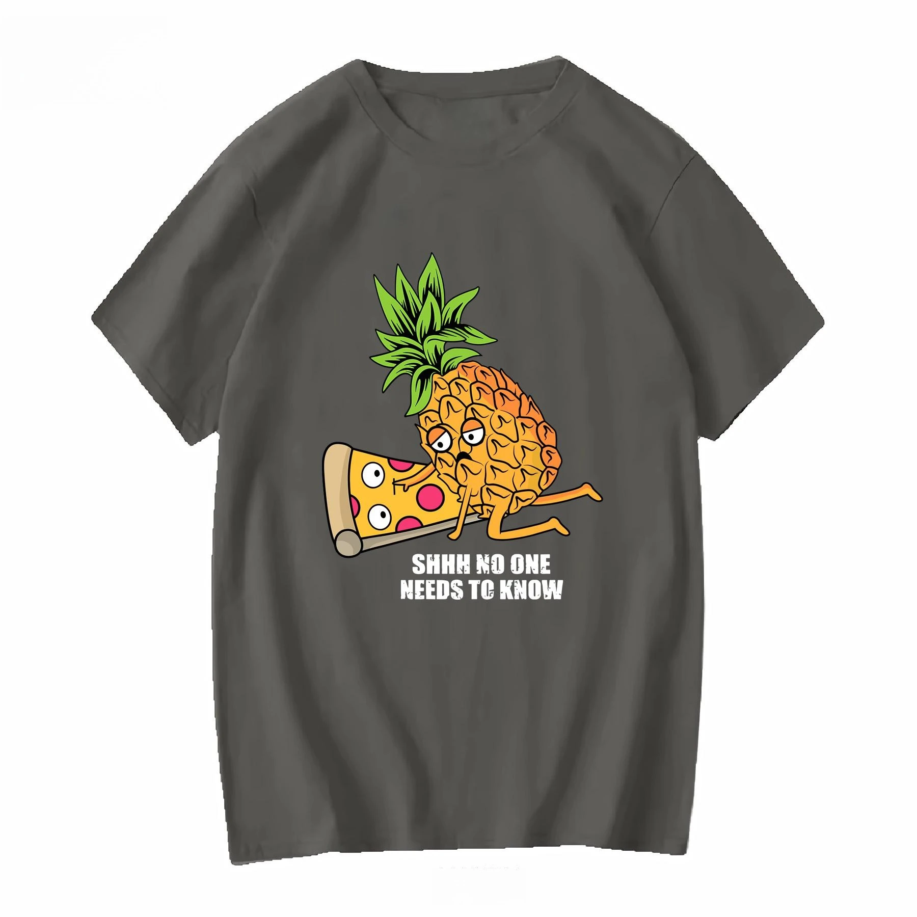 - Designed with a vibrant, colorful graphic depicting a playful cartoon pineapple with expressive eyes and a humorous pizza slice, perfect for casual humor lovers.