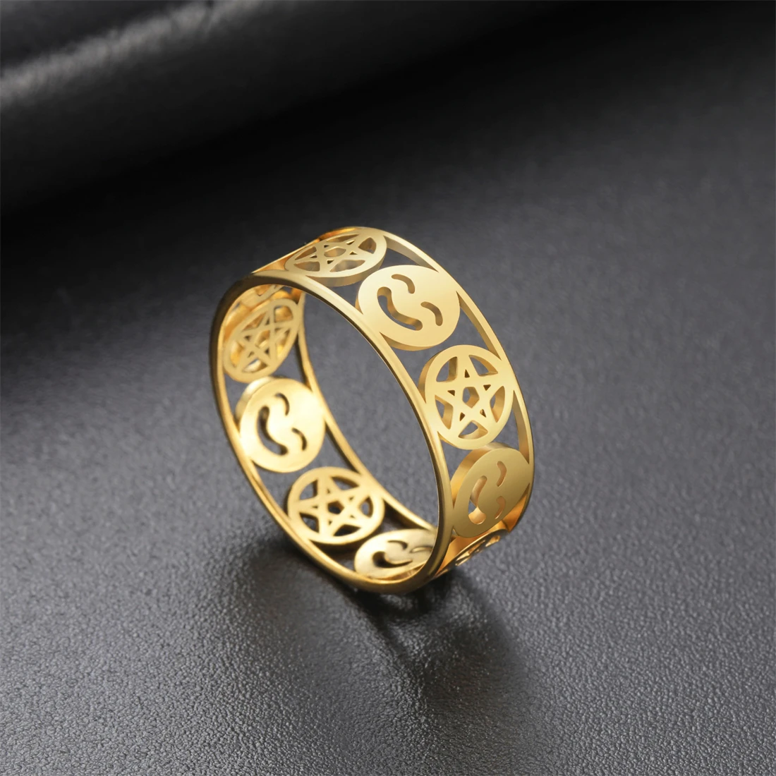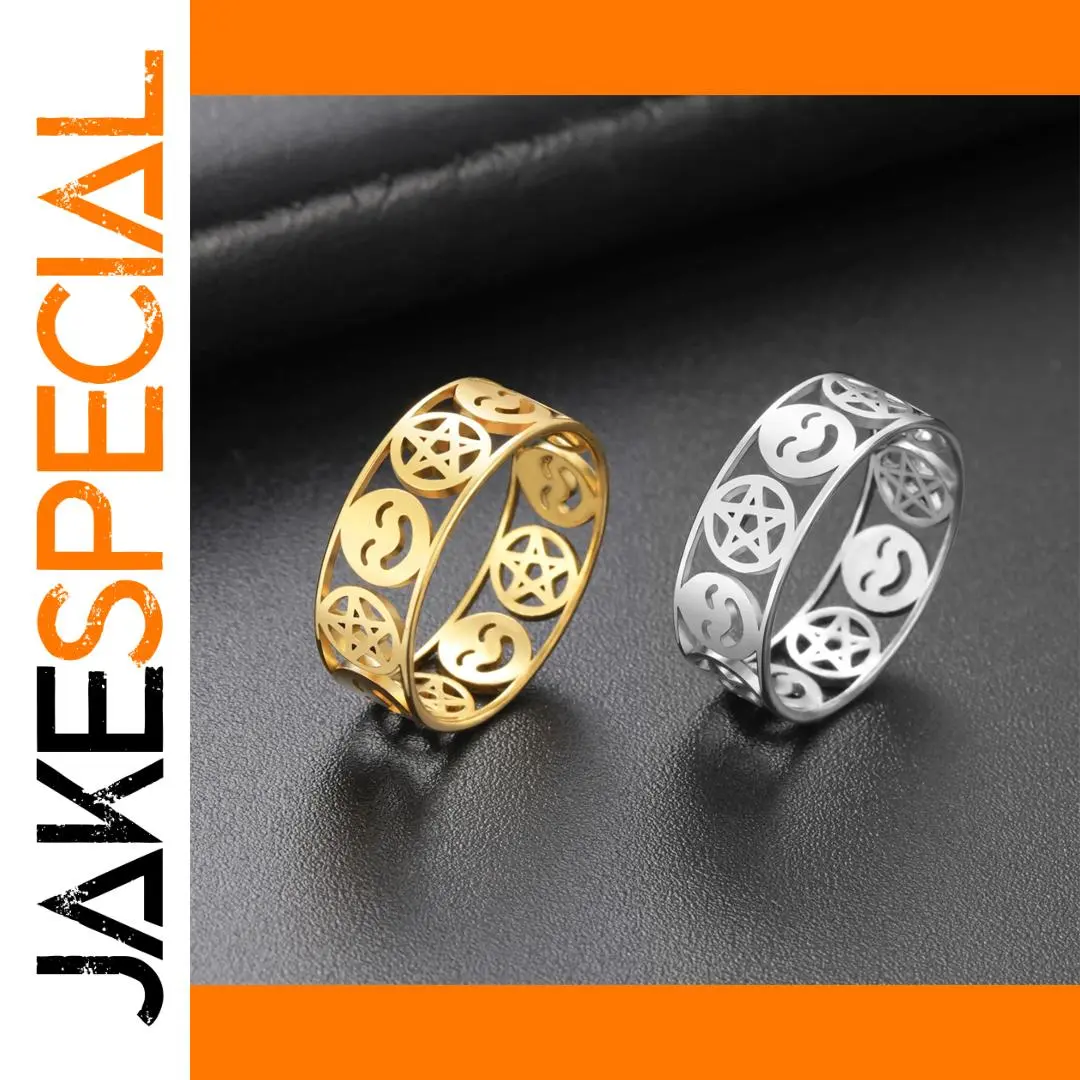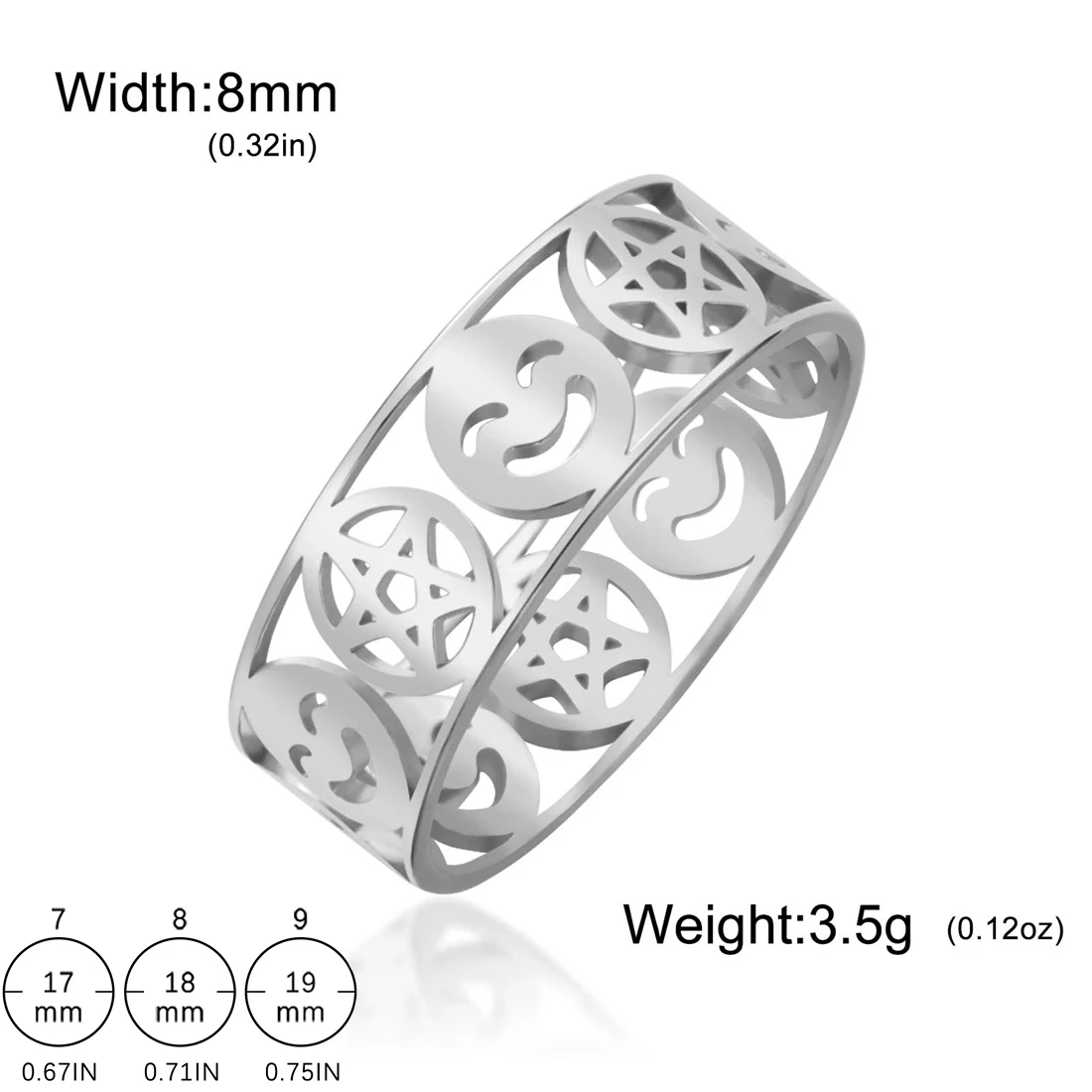 Experience the perfect blend of bold style and durability with this unisex stainless steel ring. Featuring a 8mm wide band, it showcases an openwork pattern with a charming pentagram within circles and a smiling face emoji, repeating in a continuous loop. Available in elegant gold-tone with 18k gold plating or sleek silver-tone finishes, these colors add a luxurious or modern touch, respectively. The polished surfaces reflect light beautifully, highlighting the detailed geometric design. Comfortable on the finger with a smooth, rounded interior, this ring is suitable for any occasion—from weddings and parties to everyday wear. Its durable stainless steel construction ensures that it remains stunning over time, resisting rust, deformation, fading, and corrosion.
