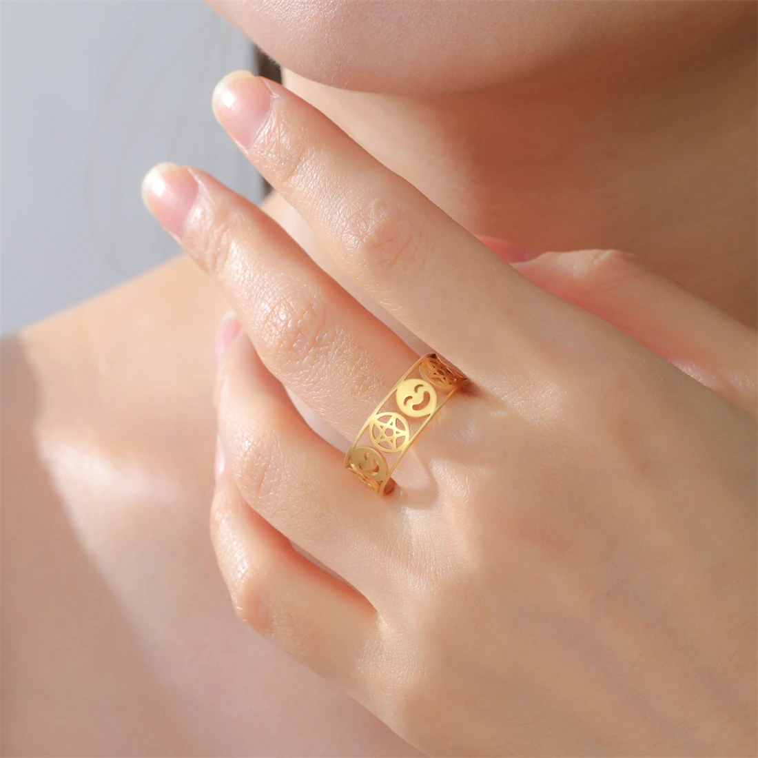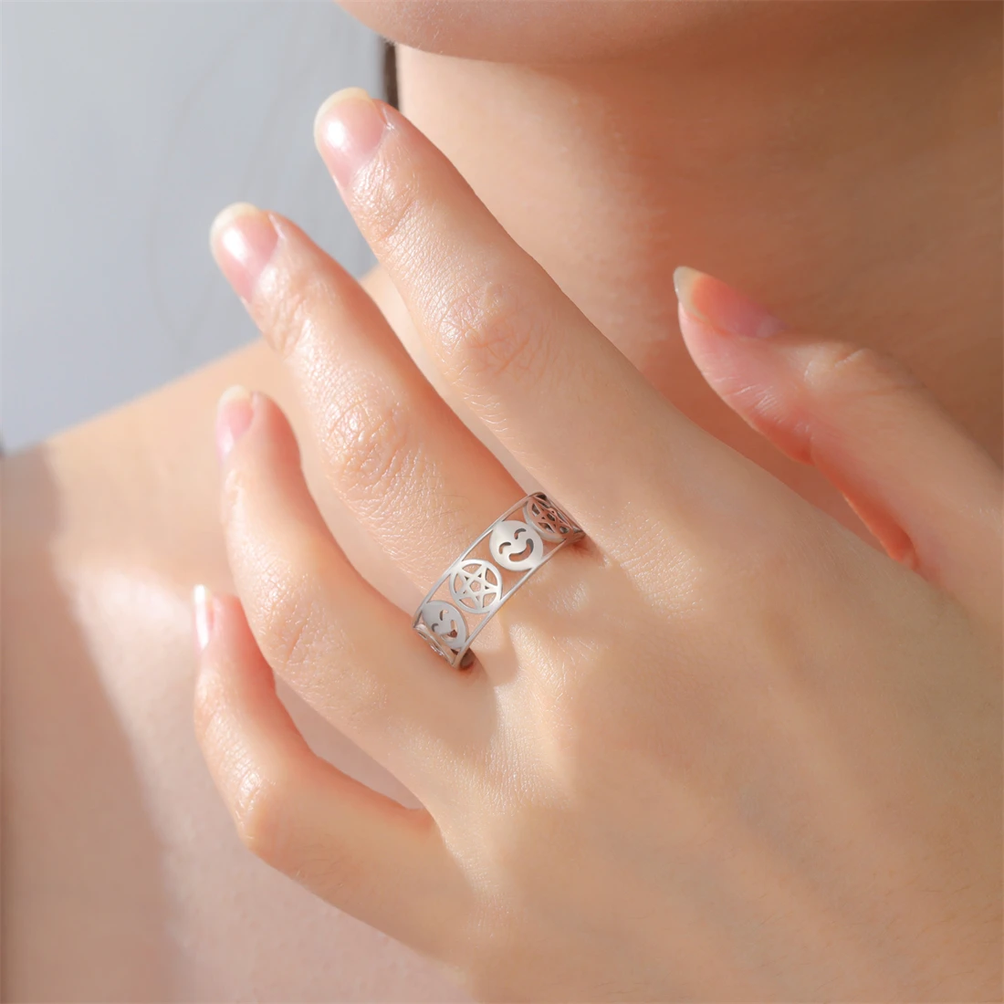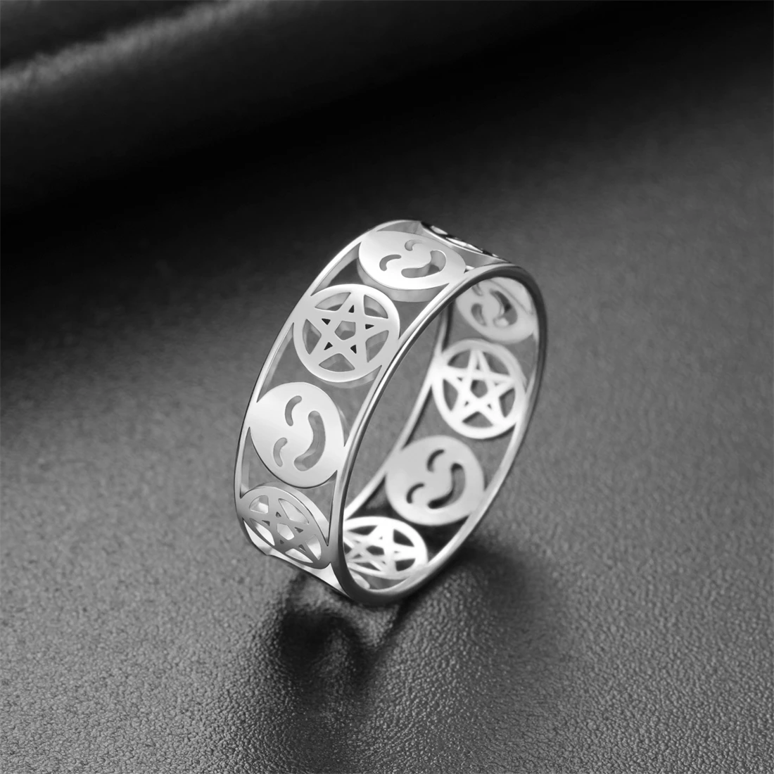 Experience the perfect blend of bold style and durability with this unisex stainless steel ring. Featuring a 8mm wide band, it showcases an openwork pattern with a charming pentagram within circles and a smiling face emoji, repeating in a continuous loop. Available in elegant gold-tone with 18k gold plating or sleek silver-tone finishes, these colors add a luxurious or modern touch, respectively. The polished surfaces reflect light beautifully, highlighting the detailed geometric design. Comfortable on the finger with a smooth, rounded interior, this ring is suitable for any occasion—from weddings and parties to everyday wear. Its durable stainless steel construction ensures that it remains stunning over time, resisting rust, deformation, fading, and corrosion.