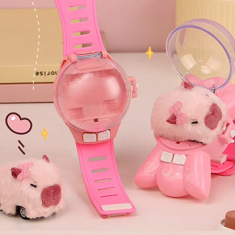 Experience the adorable charm of this 2.4G Capibala Rabbit Dog Plush Watch Remote Control Car, featuring a soft, plush pink animal head mounted on a flexible pink plastic band. The plush head, with small pointed ears—one accented with a tiny pink bow—and a relaxed expression with a dark pink embroidered nose and closed black-thread eyes, creates a playful, child-friendly aesthetic. Designed for ages 14 and above, this ready-to-use, non-electric toy operates via a 2-channel remote controller with a charging voltage of 3.7V. Available in pink, white, yellow, and other variants, it combines fun and cuteness in a durable, CE-certified package, perfect for collectors and enthusiasts.