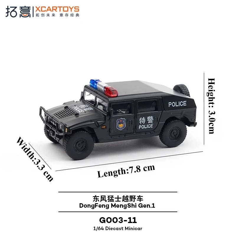 Experience the commanding presence of this 1/64 scale diecast model of a police armored assault transport truck, crafted from durable metal and finished in sleek black (G003-11). Designed for realism, it features textured black tires with realistic tread patterns, transparent windows, small side mirrors, and a detailed spare tire mounted on the rear. A bold red and blue emergency light bar atop adds to its tactical aesthetic, complemented by police insignia decals that underscore its official look. Perfect for adult collectors and enthusiasts, this rugged and detailed model offers a striking addition to any collection, embodying authority and durability in every detail.