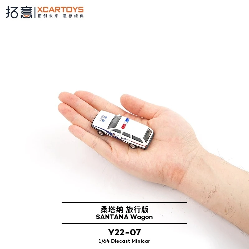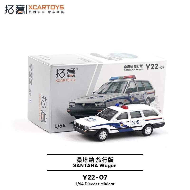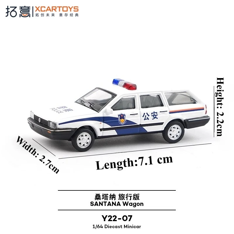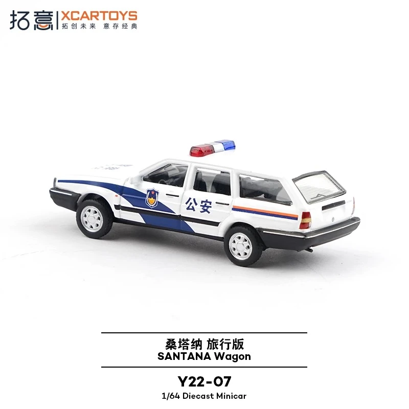 - This highly detailed 1/64 scale diecast model showcases a white Santana Wagon with blue police insignias and Chinese characters for an authentic official look.