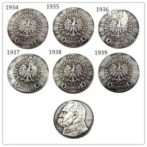 - Six detailed replica coins representing Poland's 1934-1939 currency, each with a distinct year and authentic vintage styling for collectors and decor enthusiasts.