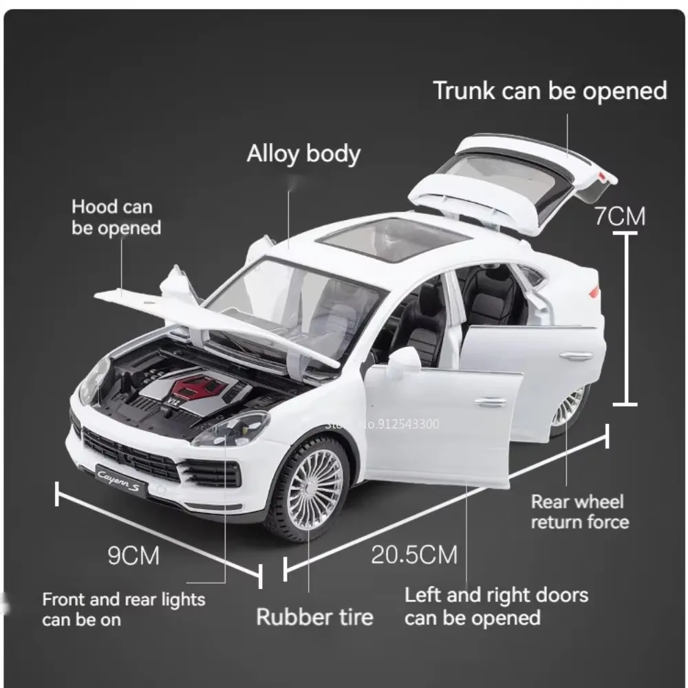 - The Porsche 911 model’s specifications include a length of approximately 20 cm for the Carrera RS version and 20.5 cm for the Cayenne S version, with detailed chrome-like finishes and authentic design elements.