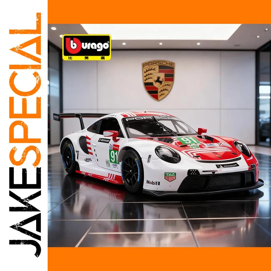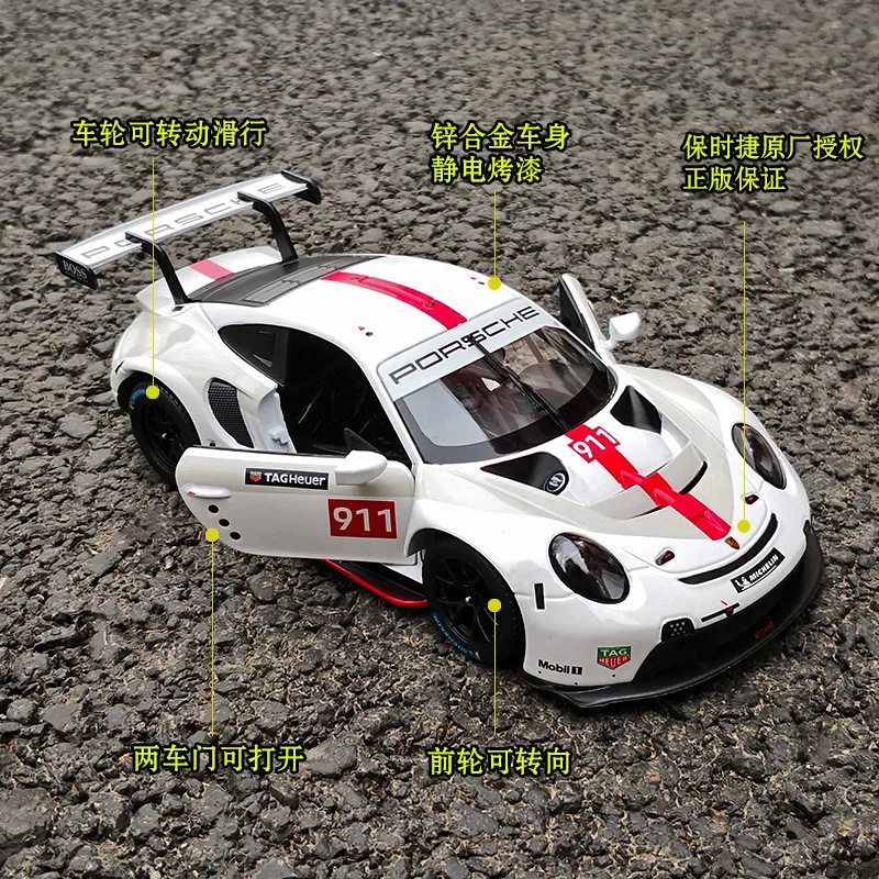 Experience the thrill of racing with this meticulously crafted 1:24 scale diecast alloy model of the Porsche 911 RSR. Featuring a sleek glossy white body accented with bold red graphics, racing stripes, and detailed aerodynamic elements like a rear wing and air intakes, this model exudes high-performance aesthetics. The black multi-spoke wheels with blue accents, clear windows revealing a detailed interior, and realistic headlights add authentic touches. Made from alloy and plastic for durability, it is suitable for collectors aged 14+ and 18+, offering a premium, collectible finish that captures the race-ready spirit of the iconic Porsche 911 RSR.