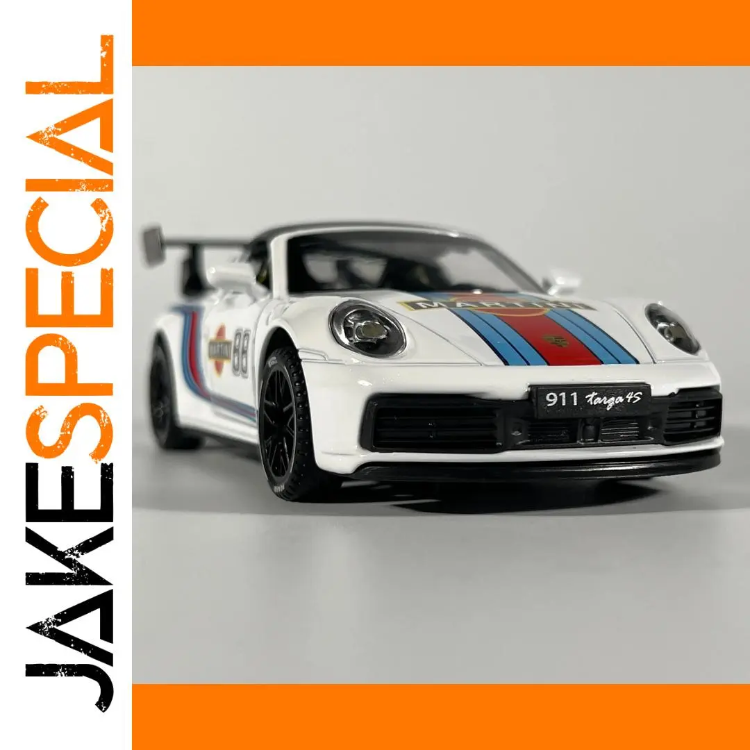 This highly detailed 1:32 scale diecast model of the Porsche 911 Targa 4S showcases exceptional craftsmanship with a durable metal construction, capturing the sleek, aerodynamic design of the real vehicle. The model is available in multiple colors, including white, black, and blue, featuring racing stripes and vivid logos that enhance its sporty appeal. Its realistic details include clear windows revealing interior elements, oval headlights, a black grille, and a prominent rear wing spoiler for an authentic appearance. Suitable for collectors and enthusiasts aged 14 and above, this model serves as an impressive display piece, combining sophistication and dynamic racing-inspired aesthetics for automotive enthusiasts.