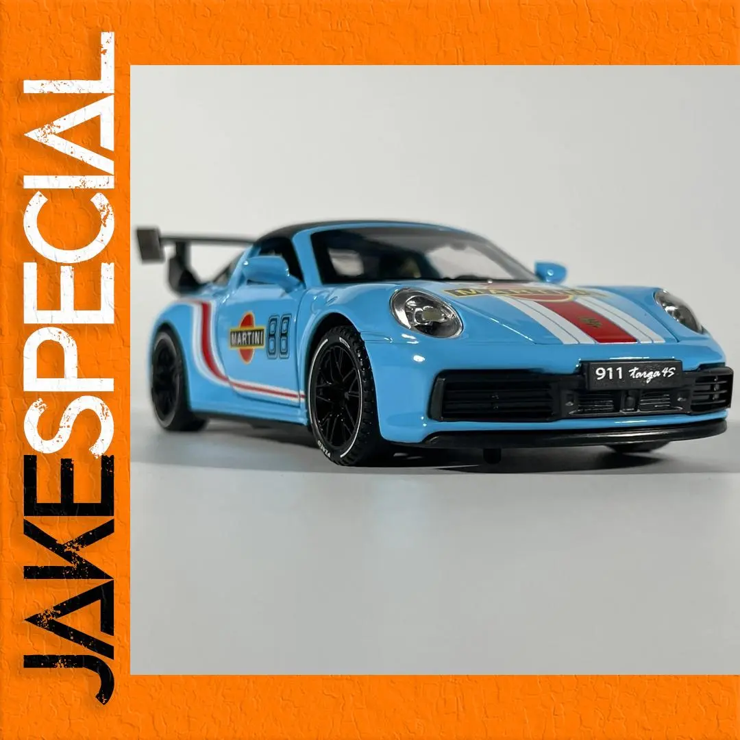 The 1:32 scale diecast model of the Porsche 911 Targa 4S celebrates the iconic design and racing heritage of this legendary car. Finished in a striking glossy blue with red and white stripes, it showcases the Martini Racing logo prominently on its side. This model features intricate details, including a sculpted hood, rounded headlights, and a distinct rear wing that enhances its aerodynamic appeal. Equipped with light and sound functions powered by a button battery, this model captures the excitement of a real racing experience while being a perfect showpiece for collectors and enthusiasts alike.