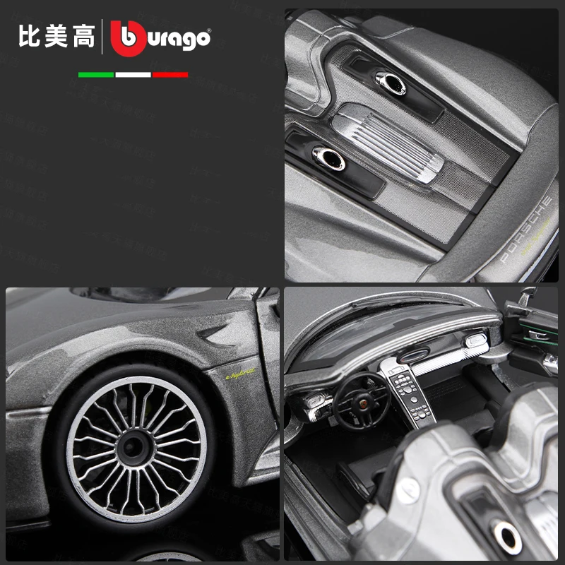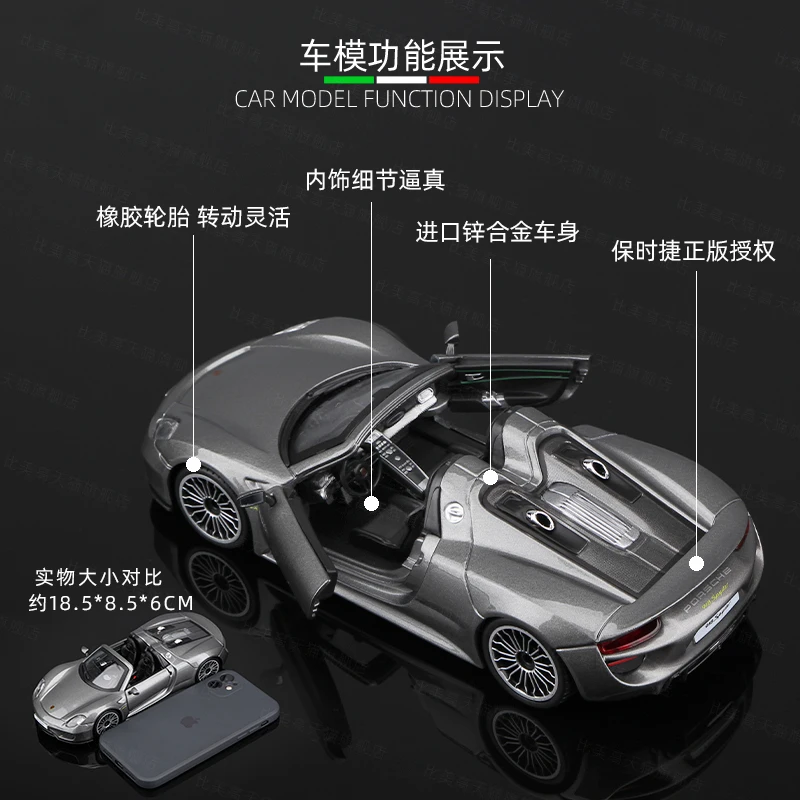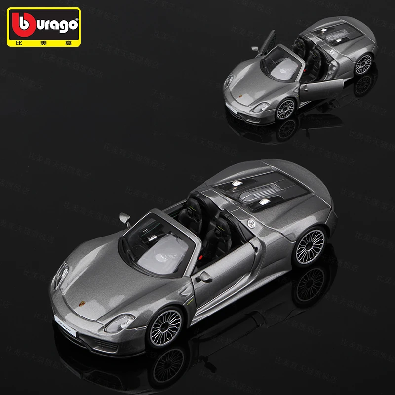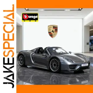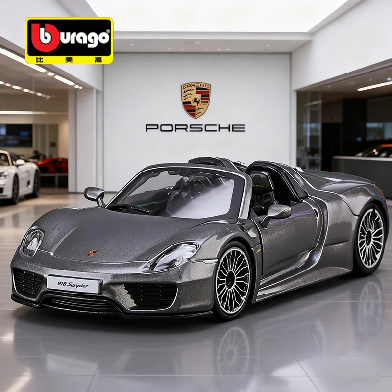 Experience the elegance of the Porsche 918 with this highly detailed 1:24 scale diecast model, crafted from alloy and plastic. Featuring a sleek, metallic gray finish, it captures the car’s aerodynamic curves, sporty profile, and refined design elements such as realistic multi-spoke rims, molded black tires, and meticulously detailed front grille, air intakes, and rear features. The open-top convertible reveals a subtle interior with black seats and dashboard, while side mirrors and other exterior accents reflect authentic craftsmanship. Perfect for adult collectors, this non-electric display piece is suitable for ages 14 and above, making it an ideal addition to any automotive or diecast collection.