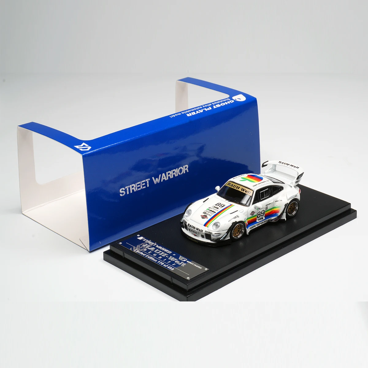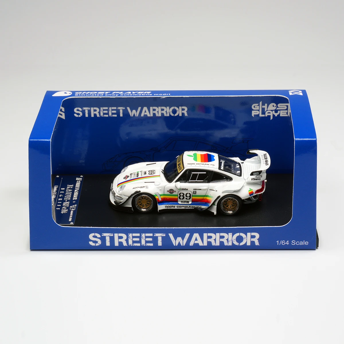 Bring your collection to life with this 1:64 scale diecast model of the Porsche 930 GT in a striking white apple widebody design. Crafted from durable metal, this highly detailed miniature features vibrant, colorful racing stripes running along the center of the hood, roof, and rear, complemented by a sleek aerodynamic silhouette and flared wheel arches fitted with gold multi-spoke rims. The model includes realistic headlight details, a prominent rear wing spoiler with black supports, and expertly applied decals that enhance its sporty and performance-oriented appearance. An ideal collectible for enthusiasts aged 14 and above, it offers durable craftsmanship and eye-catching design.