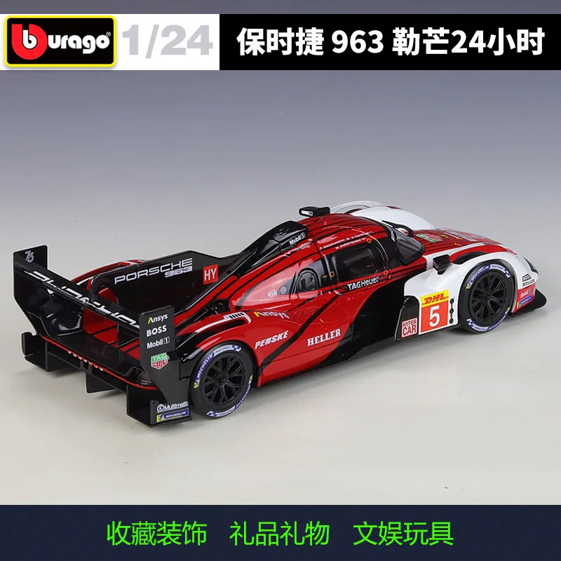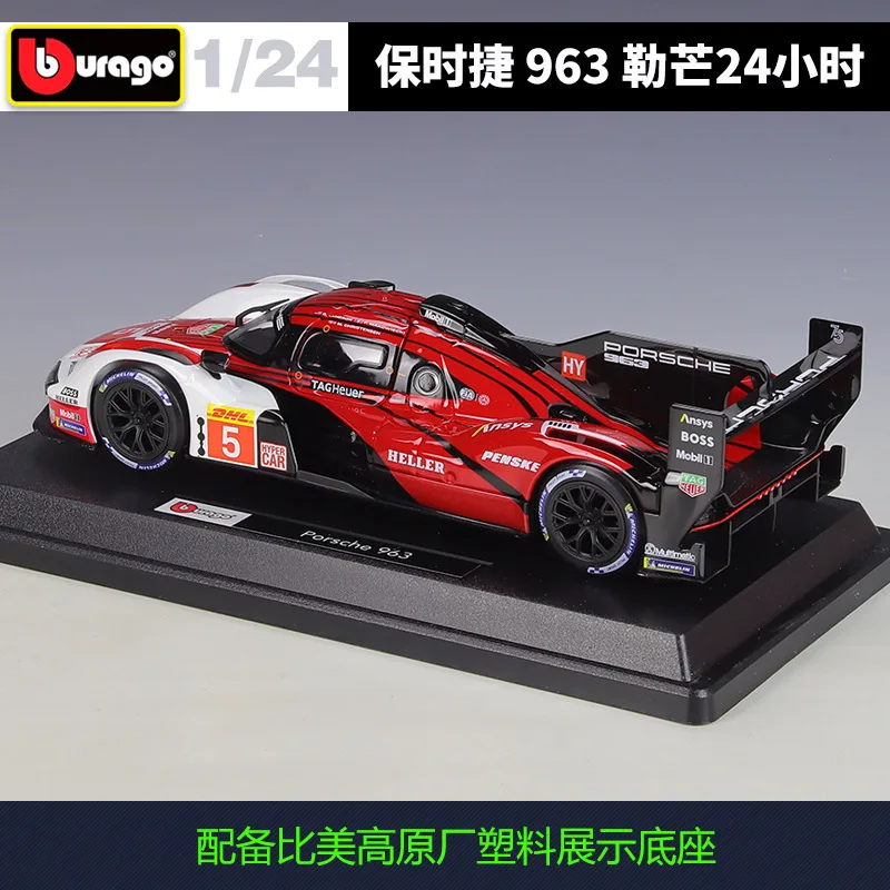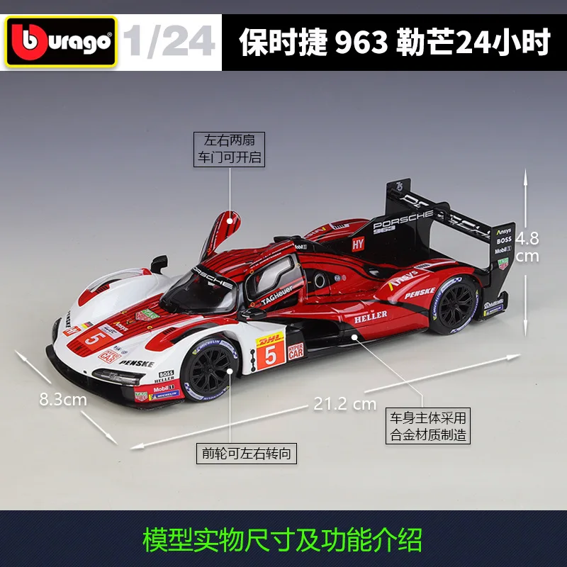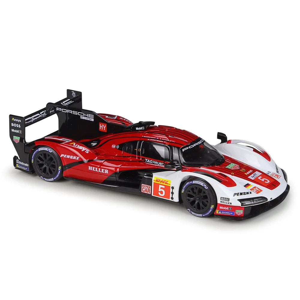 - Vibrant red color with black accents and white details accurately replicates the authentic Porsche 963 racing livery with sponsor decals like DHL, Mobil 1, and more.