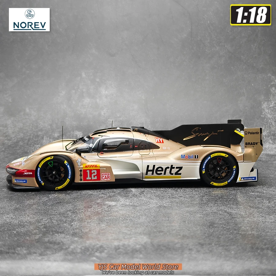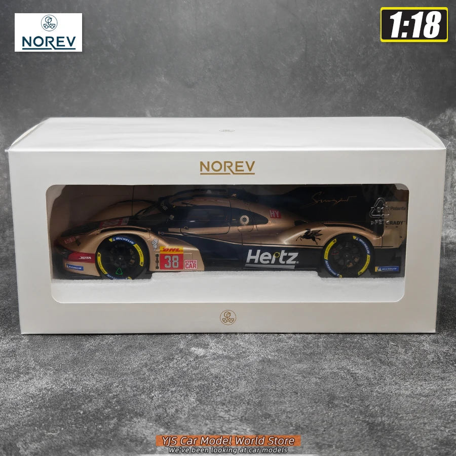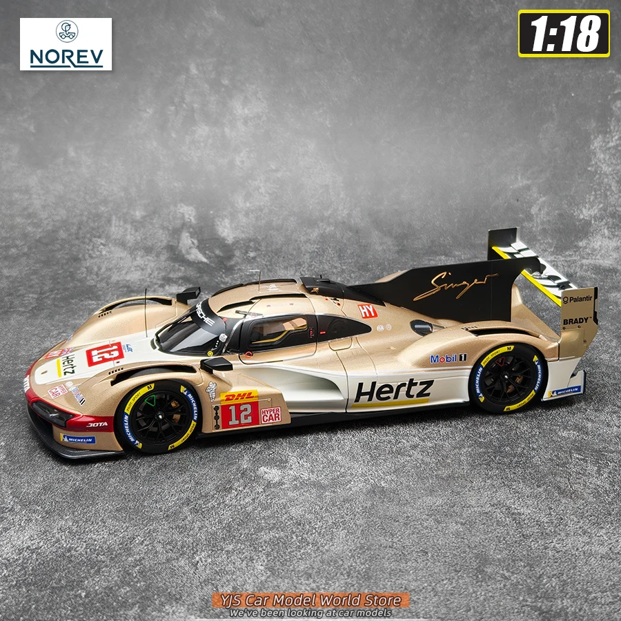 Imagine elevating your collection with this highly detailed diecast model of the Porsche 963 Hertz Team 2024, expertly crafted from metal at a 1:18 scale. Designed for true enthusiasts, this static display piece features a sleek, aerodynamic body painted in a striking gold and black color scheme, showcasing sponsor decals like Hertz, DHL, Michelin, and Mobil 1. Bright red racing numbers are prominently displayed, along with finely molded side mirrors, antennae, and intricate rear wing details that capture the spirit of high-performance racing. Its glossy finish reflects light beautifully, emphasizing the dynamic design and precise craftsmanship. Whether you’re an avid collector or an enthusiast, this model brings the thrill of racing into your space with sophistication.