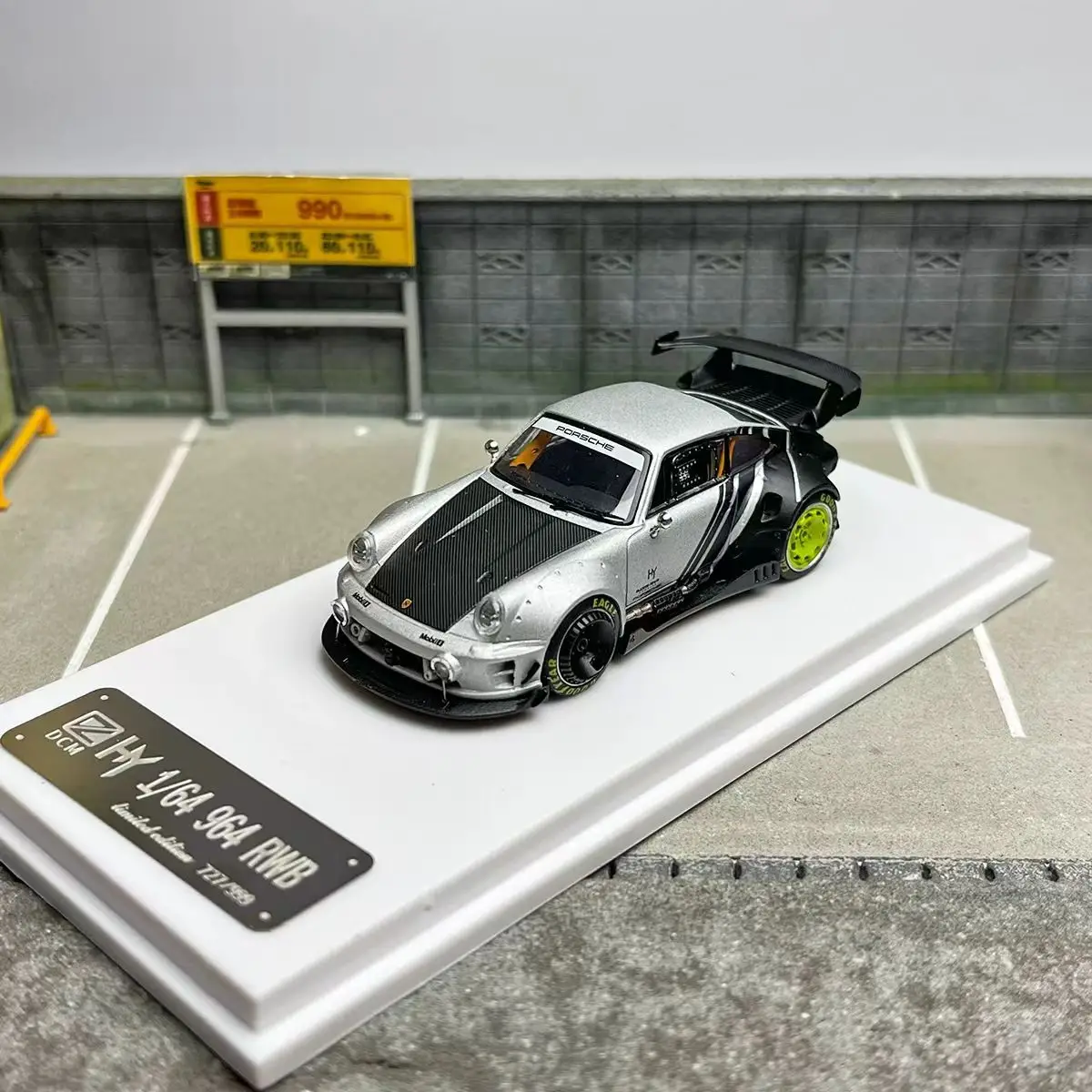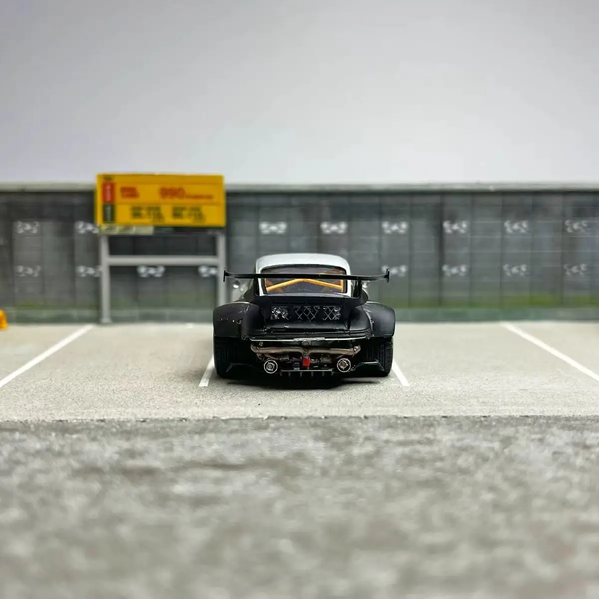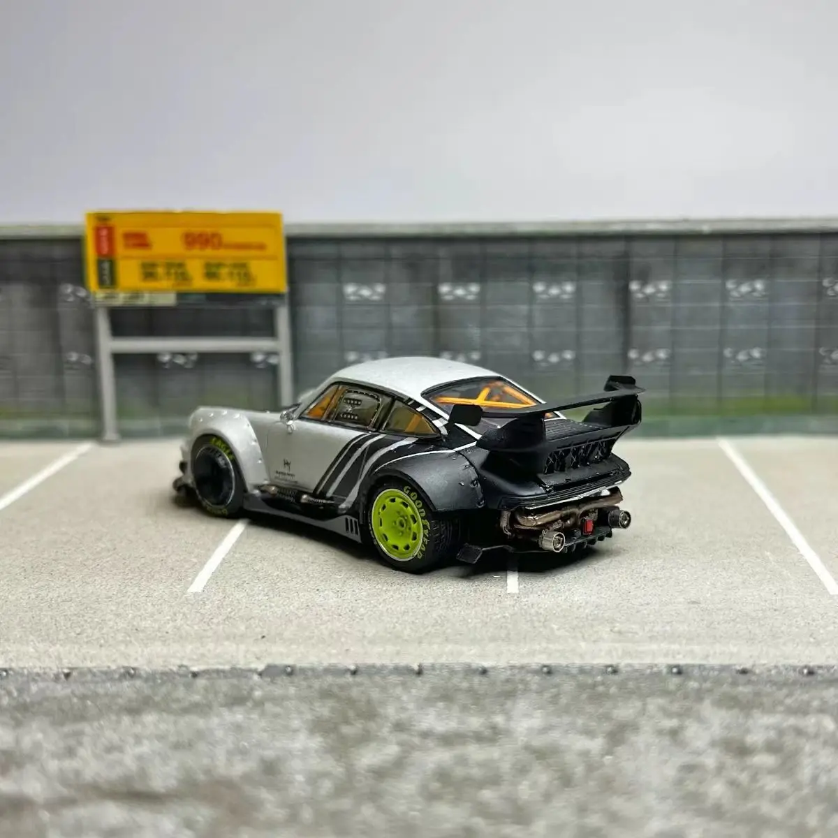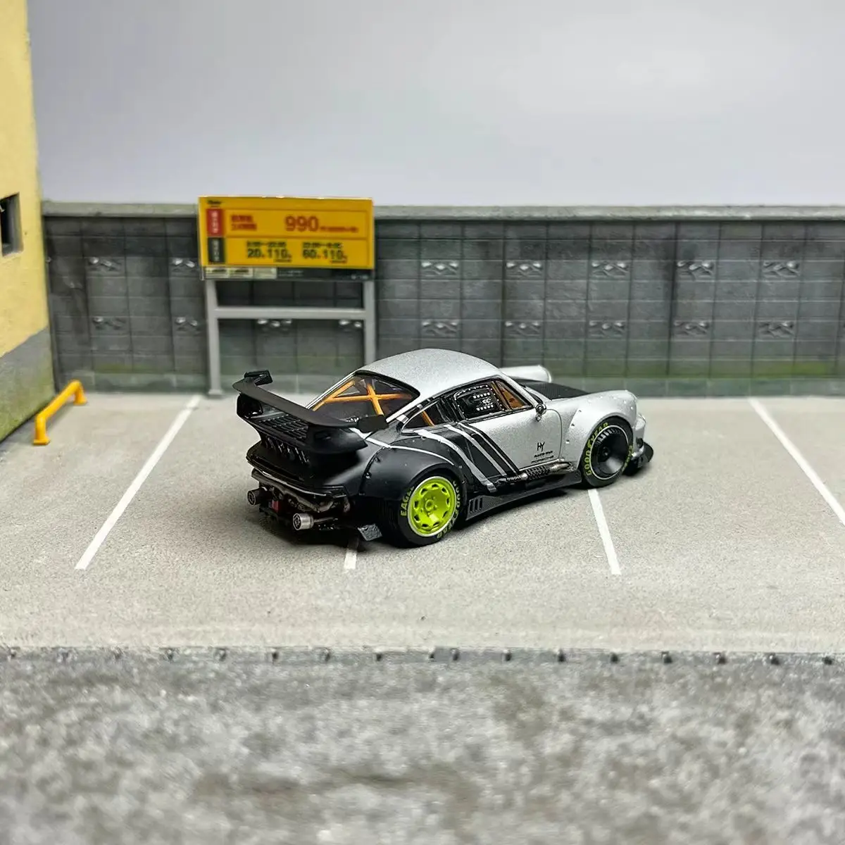 This detailed 1:64 scale die-cast model of a Porsche 964 RWB Modified Wide-body Version features a sleek alloy body with textured black panels and striking lime green rims, creating an eye-catching, sporty appearance. Crafted from alloy, plastic, and rubber, it showcases fine details like door handles, vents, and a prominent rear spoiler, capturing the high-performance aesthetic of the original. Ideal for collectors and enthusiasts, this fully enclosed, non-functional model offers a realistic display piece that emphasizes aggressive and modern design elements. Please note, minor paint flaws may be present due to manufacturing, and it’s intended for display and hobby use only, suitable for ages 14 and above.