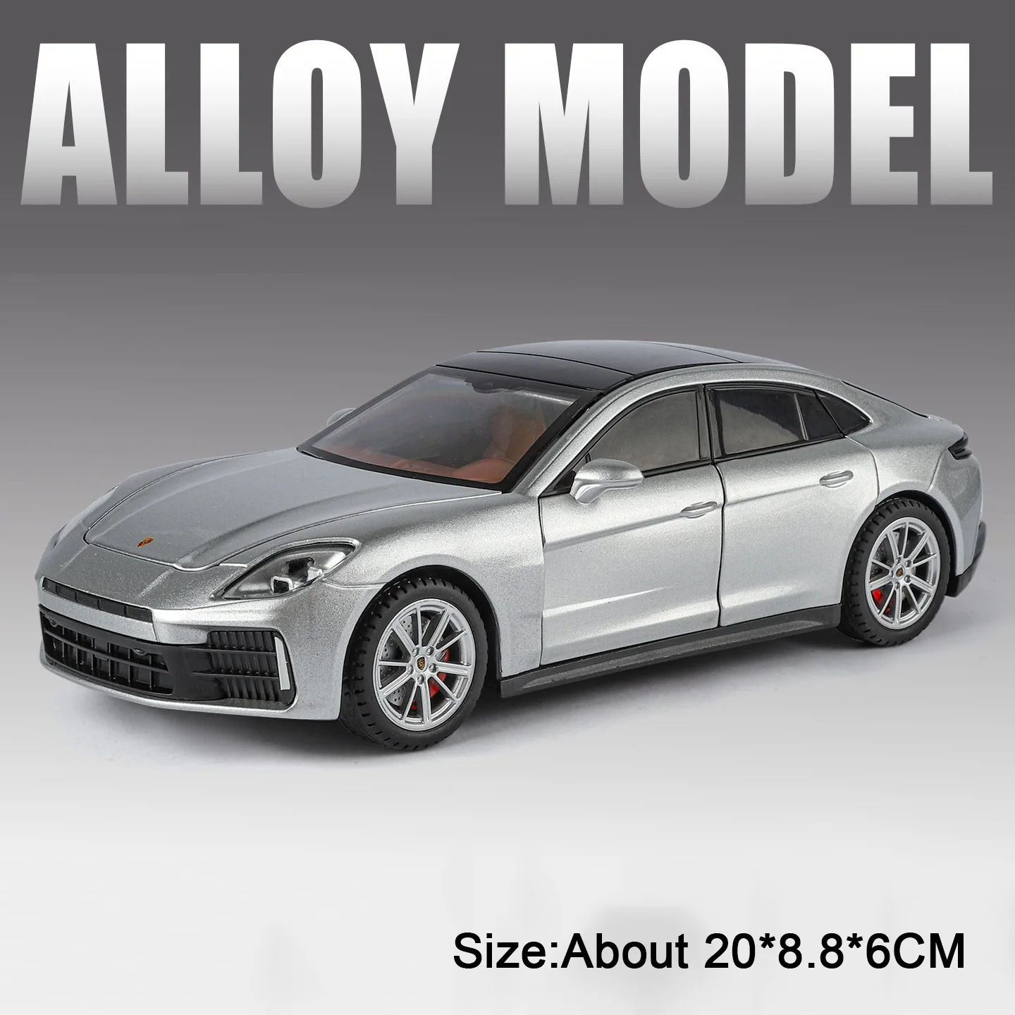 Experience the thrill of owning a meticulously crafted Porsche Panamera replica with this high-quality 1:24 scale diecast car model. Crafted from durable metal, its sleek silver finish highlights the car's modern design, while contrasting black roof and window frames add a touch of sophistication. Dark tinted windows enhance its realistic appeal, inviting you to admire every detail. The model's aerodynamic shape, with a smooth hood featuring a central ridge, embodies sportiness and elegance. Its articulated doors, functional sound and light effects, and realistic rubber tires with detailed tread make it an ideal collectible or display piece. Whether you're a car enthusiast or collecting high-end miniatures, this model promises to elevate your collection.
