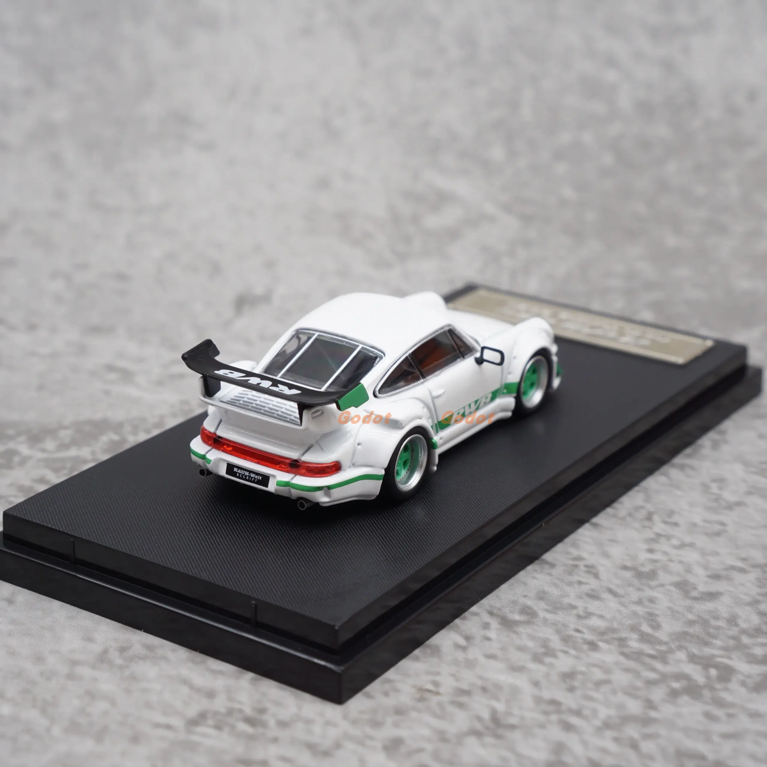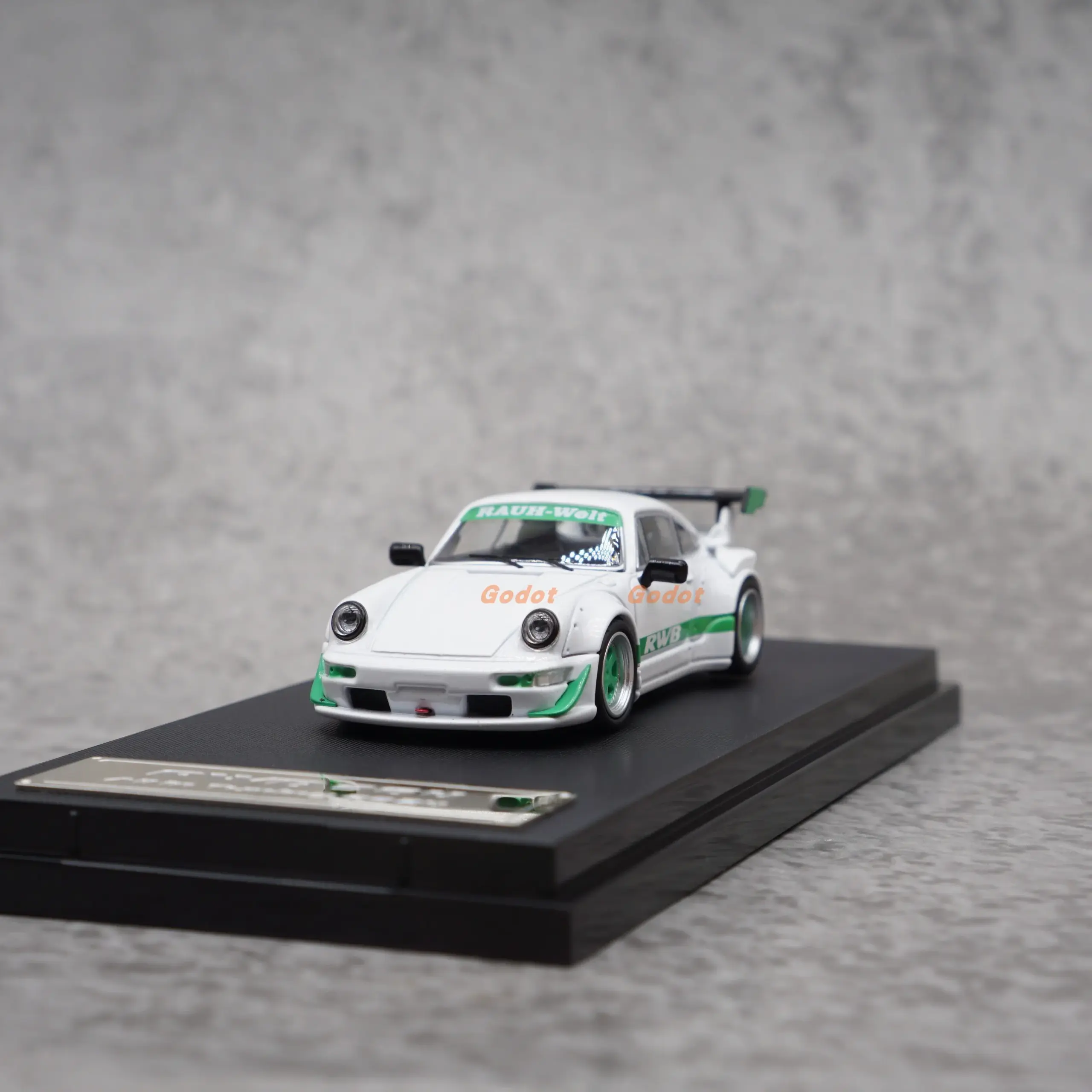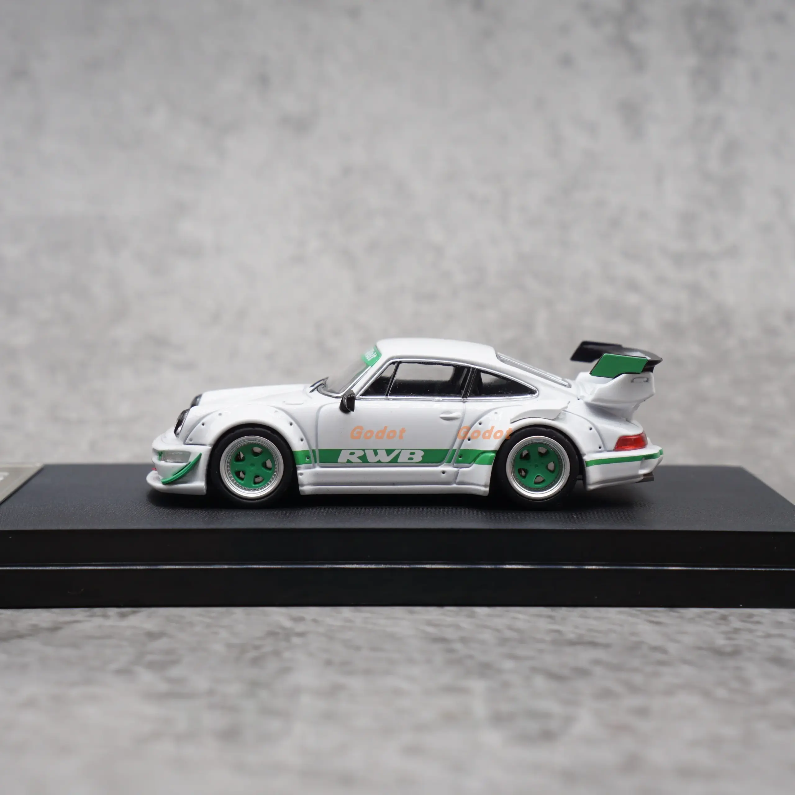 Bring home this beautifully crafted 1:64 scale diecast alloy model of the Porsche RWB 964. Perfect for adult collectors, this collectible piece showcases exceptional realism and high-quality craftsmanship. The glossy white finish, accented with vibrant green and sharp black decals, highlights its sleek, aerodynamic silhouette. Details like a smooth hood, contoured body, finely crafted side skirts, and a bold rear wing spoiler emphasize its racing heritage. The clear windows reveal a reddish interior, with small, precise door handles and black side mirrors adding to its authentic look. Whether displayed on a shelf or as part of a collection, this model embodies high-performance aesthetics combined with nostalgic allure, making it an impressive souvenir or gift for automotive enthusiasts.