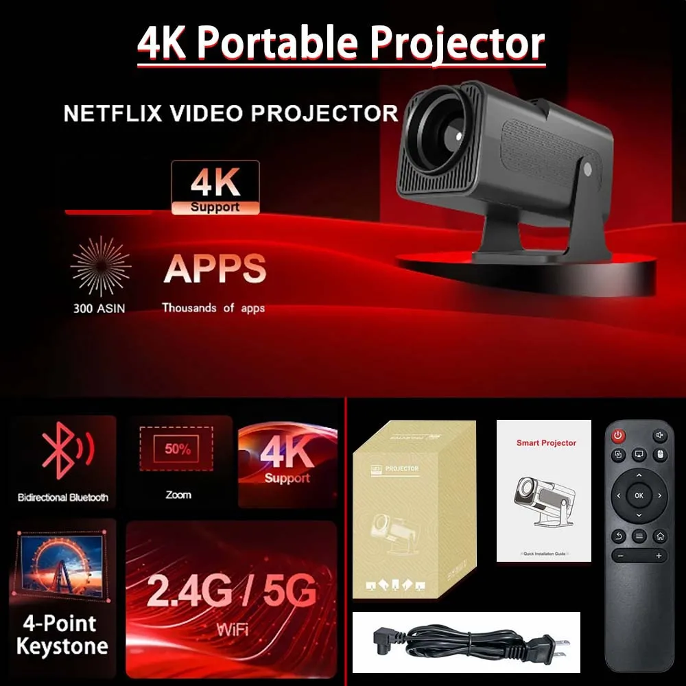Experience the convenience of this sleek, portable mini projector powered by Android 11 OS. Its modern, cylindrical design with smooth, rounded edges and matte black finish exudes elegance and professionalism. The prominent wide lens features concentric, ribbed rings, adding subtle texture while ensuring optimal heat dissipation. Perfectly suited for outdoor or indoor entertainment, this projector offers effortless portability with its lightweight construction and adjustable projection angle. Easily connect via dual WiFi bands (2.4G/5G) using WiFi 6 technology for ultrafast, stable streaming and gaming. With automatic keystone correction, diffuse LED eye protection lighting, and a projection size from 85 to 130″, you can enjoy stunning visuals anytime, anywhere. Its minimalist look is designed for quick setup and reliable performance.