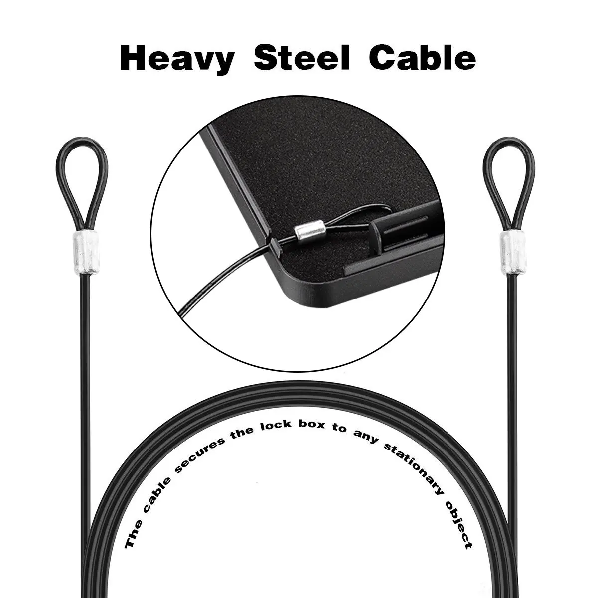 - Includes a heavy-duty steel cable for fixing the safe to a stationary object, ideal for preventing theft or accidental opening, with wall-mounting capabilities if required.