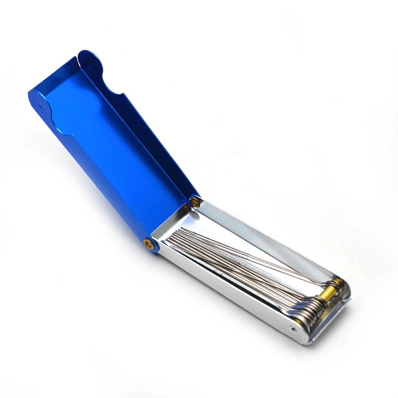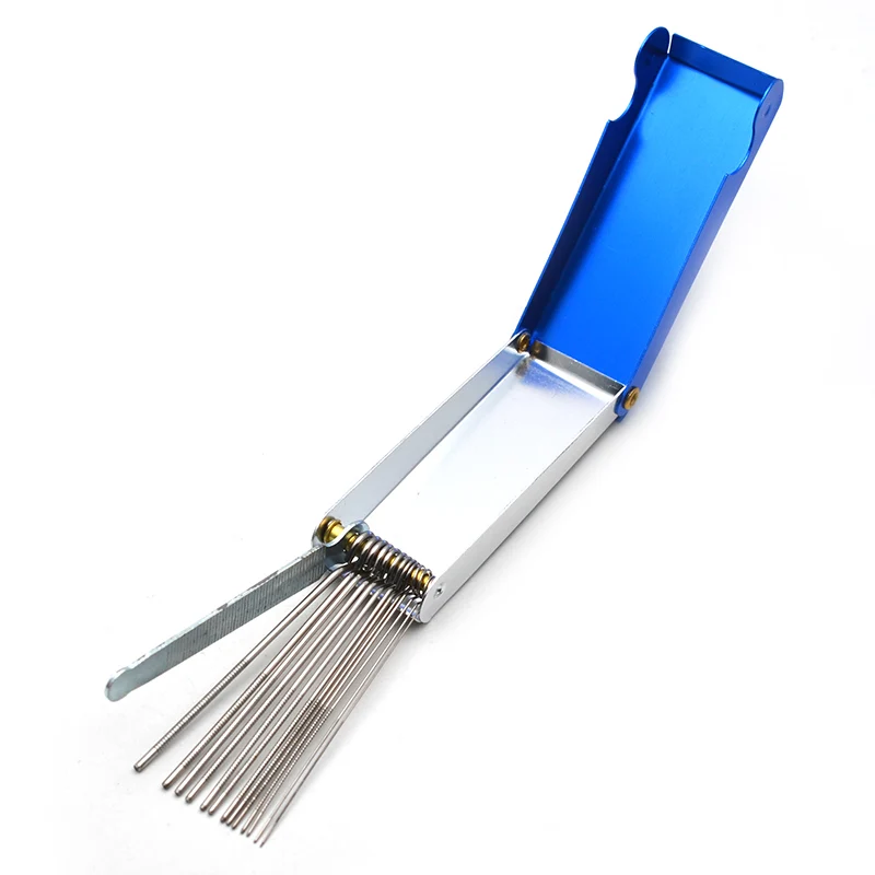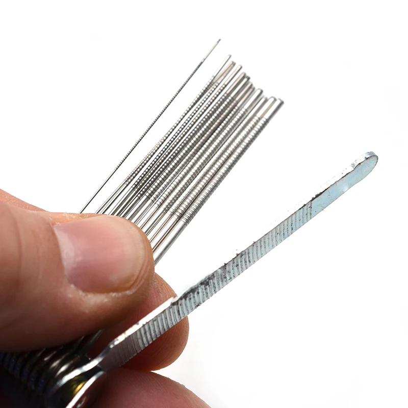 This portable guitar repair tool set features 13 high-quality metal round files and 1 flat file, measuring 7.7 cm by 3 cm by 1.5 cm and weighing 23.5 grams. Designed for use on string instruments like guitars, mandolins, basses, ukuleles, and banjos, it offers versatile tools for polishing, smoothing string slots, and burnishing nuts and bridges. The set provides quiet operation and durable performance, making it an essential companion for luthiers, guitar enthusiasts, and repair professionals. Its compact, sturdy design ensures easy portability and precise craftsmanship for detailed maintenance and setup work.